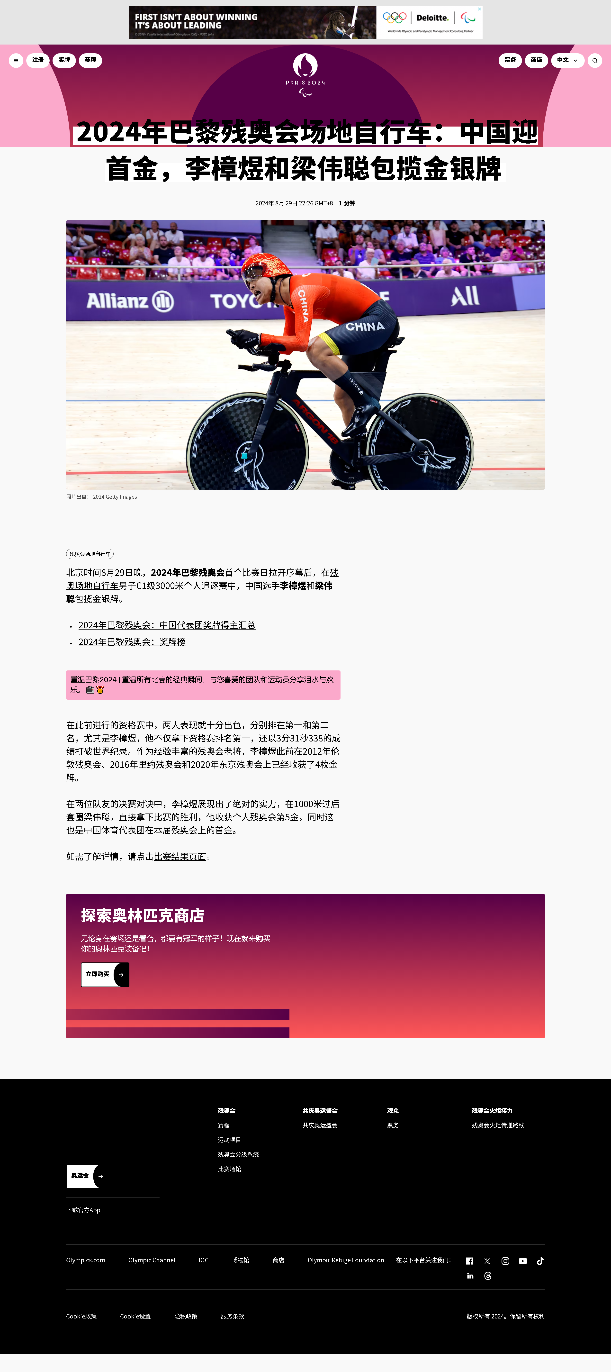 欣闻我国残疾人运动员李樟煜在第十七届夏季残奥会自行车男子C1级3000米个人追逐比赛中勇夺桂冠,获得中国体育代表团在本届残奥会上的首枚金牌,展现了自强拼搏、奋勇争先的精神风貌,为祖国和人民赢得了荣誉。我代表党中央、国务院向获奖运动员和中国体育代表团表示热烈祝贺和诚挚慰问!