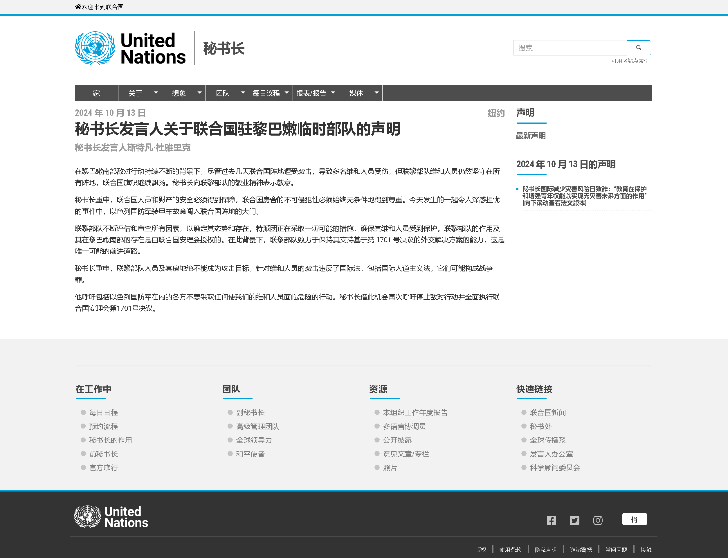 当地时间10月13日,联合国秘书长发言人发布关于联合国驻黎巴嫩临时部队的声明。在声明中,古特雷斯明确,联黎部队人员及其驻地绝不能成为攻击目标,对维和人员的袭击违反了国际法和国际人道主义法,此举可能构成战争罪。
