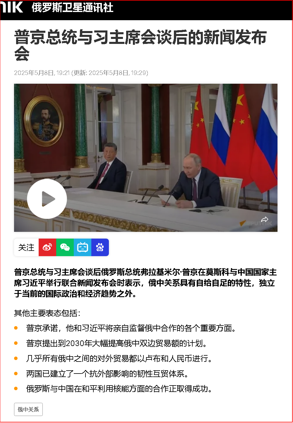 普京表示,热烈欢迎习近平主席对俄罗斯进行国事访问并出席伟大卫国战争胜利80周年纪念活动。这次访问意义重大,不仅将为俄中关系发展注入强劲动力,也将共同维护二战胜利成果。