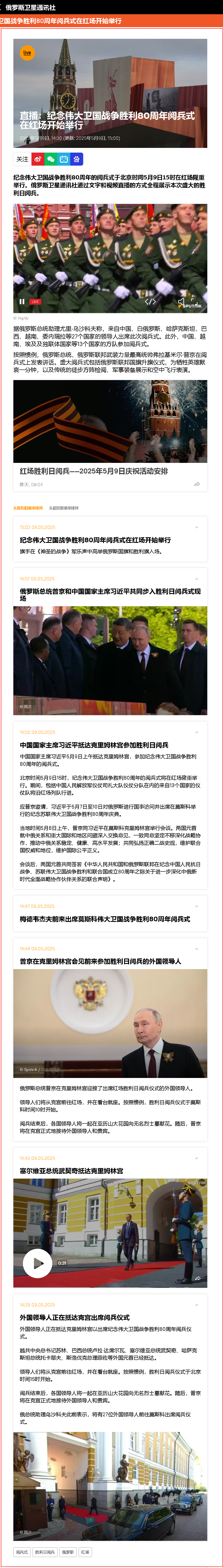 新华社莫斯科5月9日电(记者倪四义 丁得启)当地时间5月9日,俄罗斯举行盛大庆典,纪念苏联伟大卫国战争胜利80周年。国家主席习近平和来自世界20多个国家及国际组织领导人应邀出席庆典。