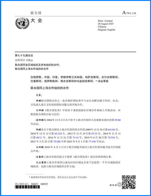 中国常驻联合国代表团临时代办耿爽在联大全会介绍决议草案时表示,上合组织成立24年来,在“上海精神”引领下不断发展壮大,已成为世界上最大的区域组织。天津峰会的最大亮点是习近平主席在“上海合作组织+”会议上提出全球治理倡议。中方倡议得到各方热烈欢迎和积极响应。大家一致认为,当今世界亟需更加有效的治理理念和治理体系,中国提出全球治理倡议正当其时。