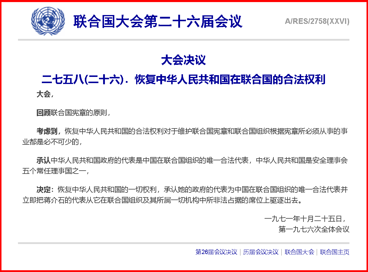 1971年10月25日,第26届联合国大会以压倒性多数通过第2758号决议,“决定恢复中华人民共和国的一切权利,承认中华人民共和国政府的代表为中国在联合国组织的唯一合法代表并立即把蒋介石的代表从它在联合国组织及其所属一切机构中所非法占据的席位上驱逐出去”。该决议从政治上、法律上和程序上干净彻底地解决了包括台湾在内全中国在联合国的代表权问题。它的合法性、有效性、权威性不容挑战。