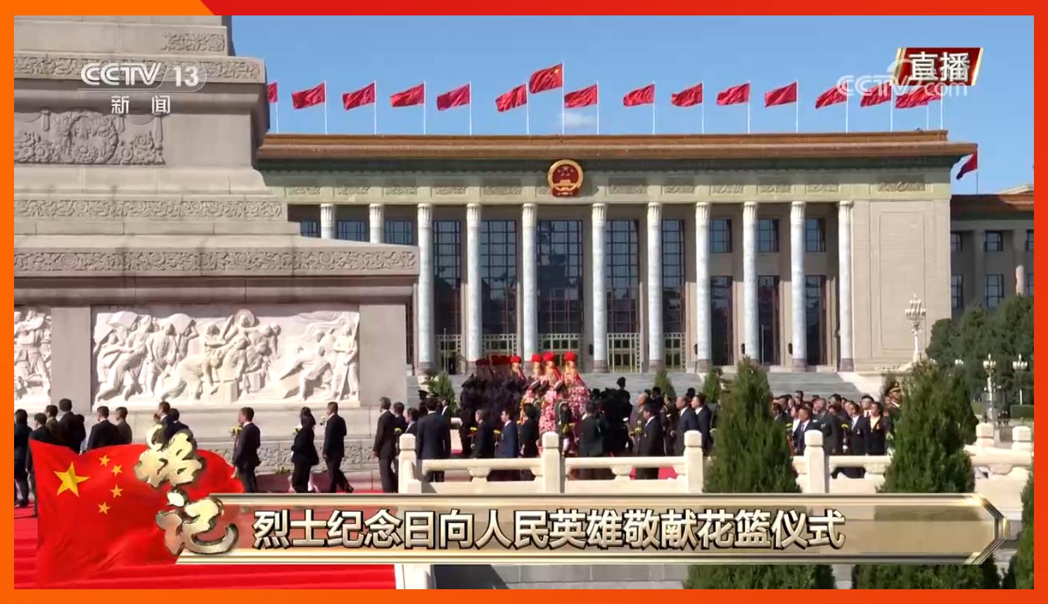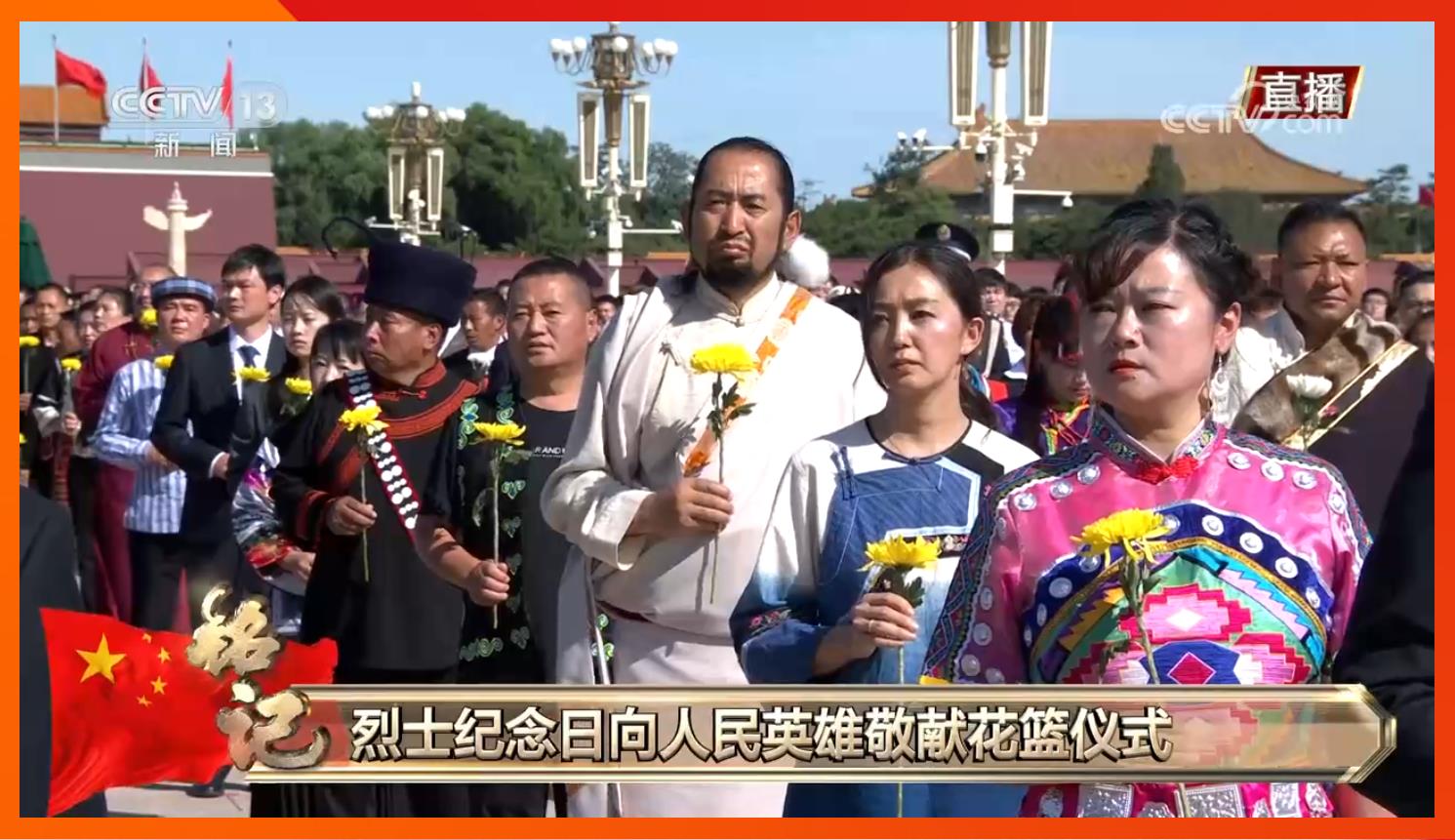方阵前,以中共中央,全国人大常委会,国务院,全国政协,中央军委,各民主党派、全国工商联和无党派爱国人士,各人民团体和各界群众,老战士、老同志和烈士亲属,中国少年先锋队名义敬献的9个大型花篮一字排开,花篮红色缎带上书写的“人民英雄永垂不朽”格外醒目。