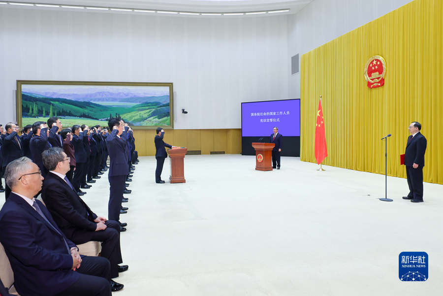 宣誓后,国务院总理李强作了讲话。他强调,誓词虽短,但字字千钧,希望大家把铮铮誓言铭记于心、践之于行,忠于宪法、忠于祖国、忠于人民,不辜负党和人民的重托。要坚持用习近平新时代中国特色社会主义思想凝心铸魂,深刻领悟“两个确立”的决定性意义,坚决做到“两个维护”,不断提高政治判断力、政治领悟力、政治执行力,当好贯彻党中央决策部署的执行者、行动派、实干家。要倍加珍惜党和人民赋予的平台,以奋发有为的精神状态干事创业,紧紧围绕推进高质量发展这个首要任务,持续深化改革、扩大开放、推动创新、改善民生,勇于打破常规,善于开辟新局,抓住主要矛盾综合施策,聚焦瓶颈制约持续攻坚,以实干实绩践行誓言。要牢固树立正确的权力观、政绩观、事业观,严格按照法定权限和程序履行职责、行使权力、承担责任,始终绷紧廉洁自律这根弦,时时处处严格要求自己,坚决反对形式主义、官僚主义,大力弘扬勤俭节约、艰苦奋斗的优良作风,为全面建设社会主义现代化国家、实现中华民族伟大复兴中国梦不懈奋斗。
