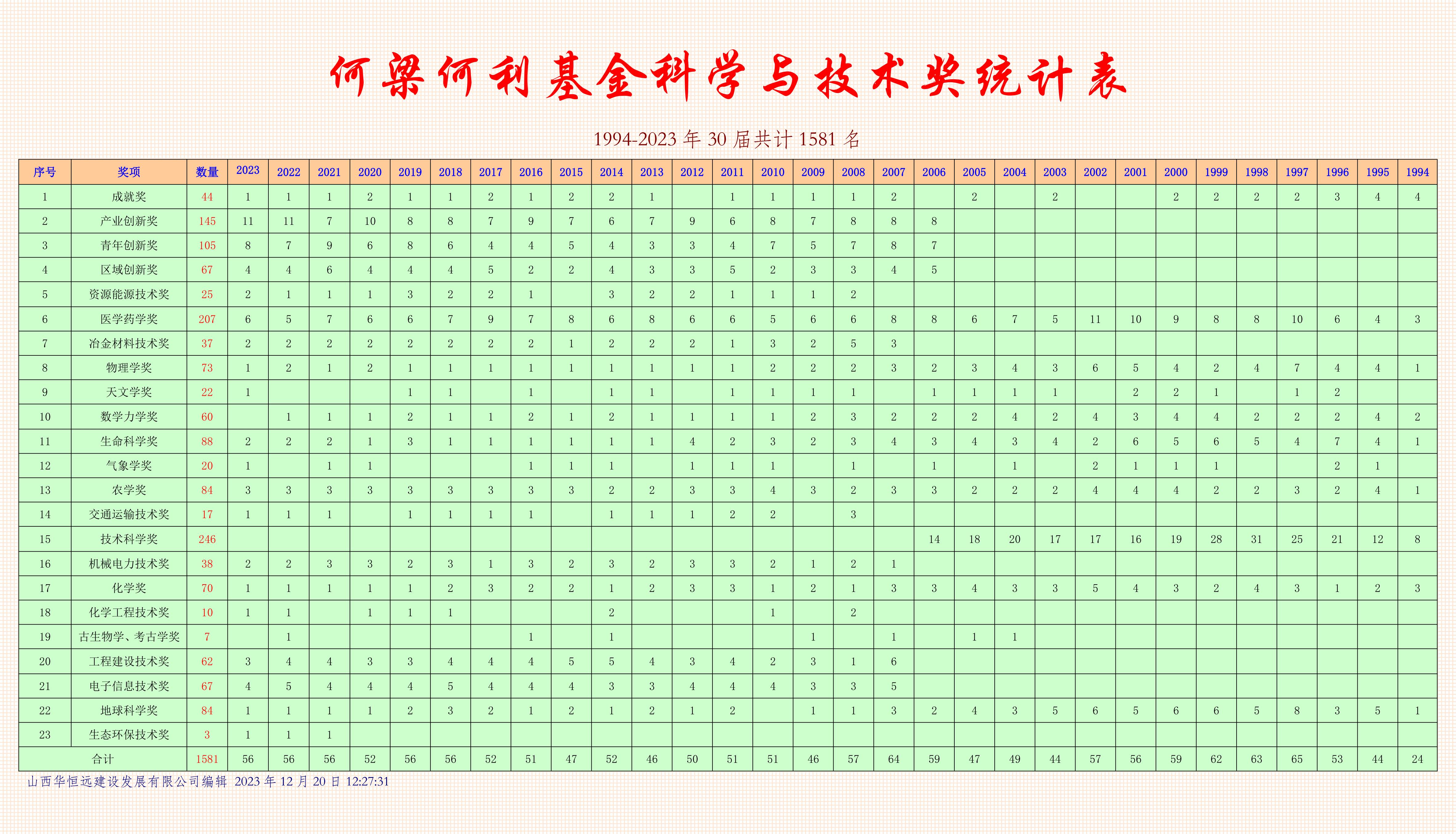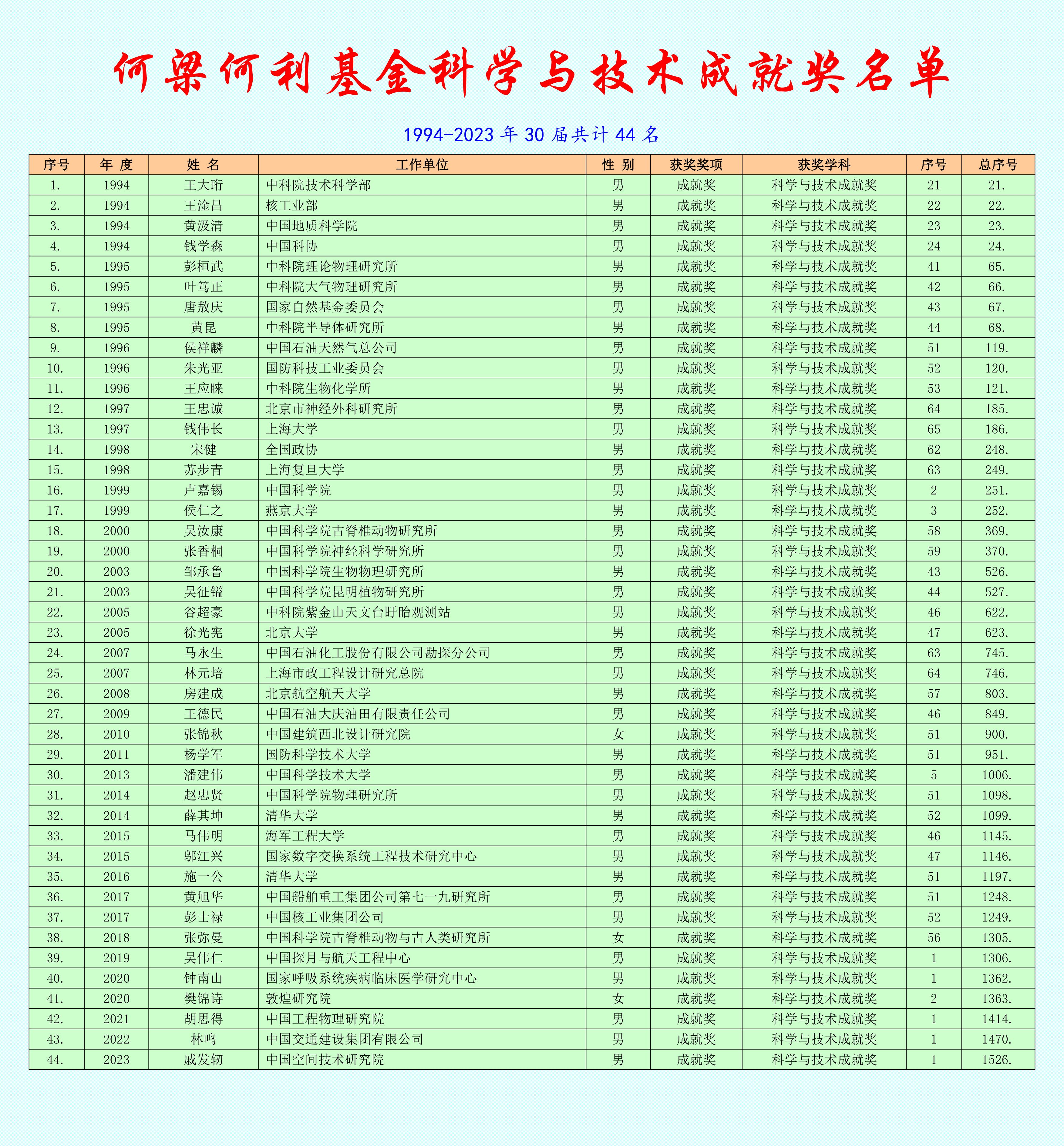 何梁何利基金科学与技术进步奖授予32位在物理、化学、生命科学、工程技术等领域取得重大科学发现或作出突出贡献的优秀科技工作者。何梁何利基金科学与技术创新奖下设青年创新奖(8人)、产业创新奖(11人)、区域创新奖(4人)三大类,共授予23位优秀科技工作者。