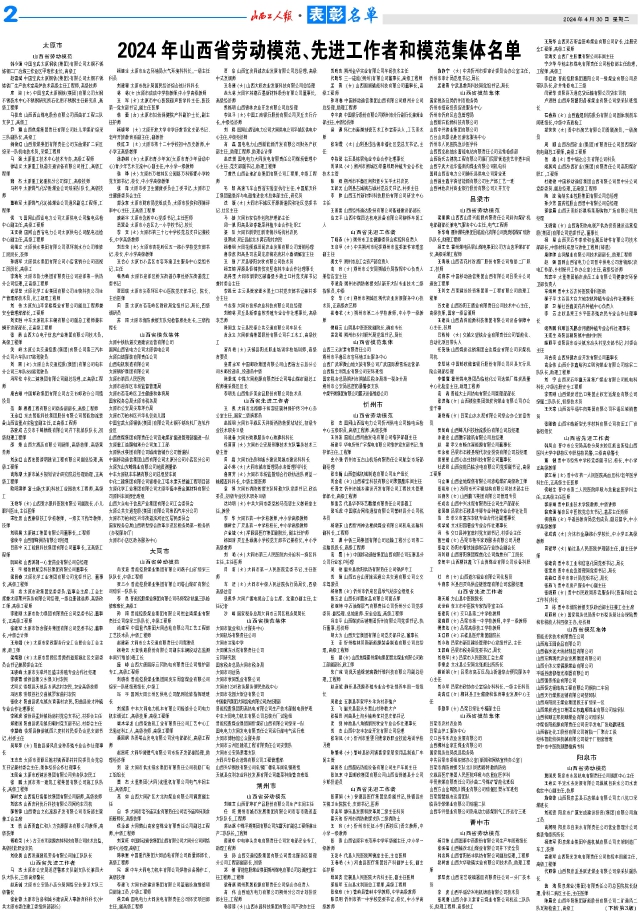近年来,全省上下坚持以习近平新时代中国特色社会主义思想为指导,全面贯彻落实党的二十大和二十届二中全会精神,深入学习贯彻习近平总书记对山西工作的重要讲话重要指示精神,坚决扛牢国家资源型经济转型综改试验区建设、深化能源革命综合改革试点、推动黄河流域生态保护和高质量发展、打造内陆地区对外开放新高地等重大使命任务,勠力攻坚、真抓实干,推动山西经济社会各项事业取得新进展,各行各业、各条战线涌现出一大批爱岗敬业、无私奉献,锐意创新、勇于担当,贡献突出、事迹感人的劳动模范、先进工作者和模范集体。为表彰先进树榜样,凝心聚力再出发,大力弘扬劳模精神、劳动精神和工匠精神,激励全省人民以辛勤劳动、诚实劳动、创造性劳动投身高质量发展和现代化建设的火热实践,省委、省政府决定授予庄迎等503名同志“山西省劳动模范”荣誉称号;授予楚志兵等194名同志“山西省先进工作者”荣誉称号;授予太原重工股份有限公司技术中心等200个集体“山西省模范集体”荣誉称号。