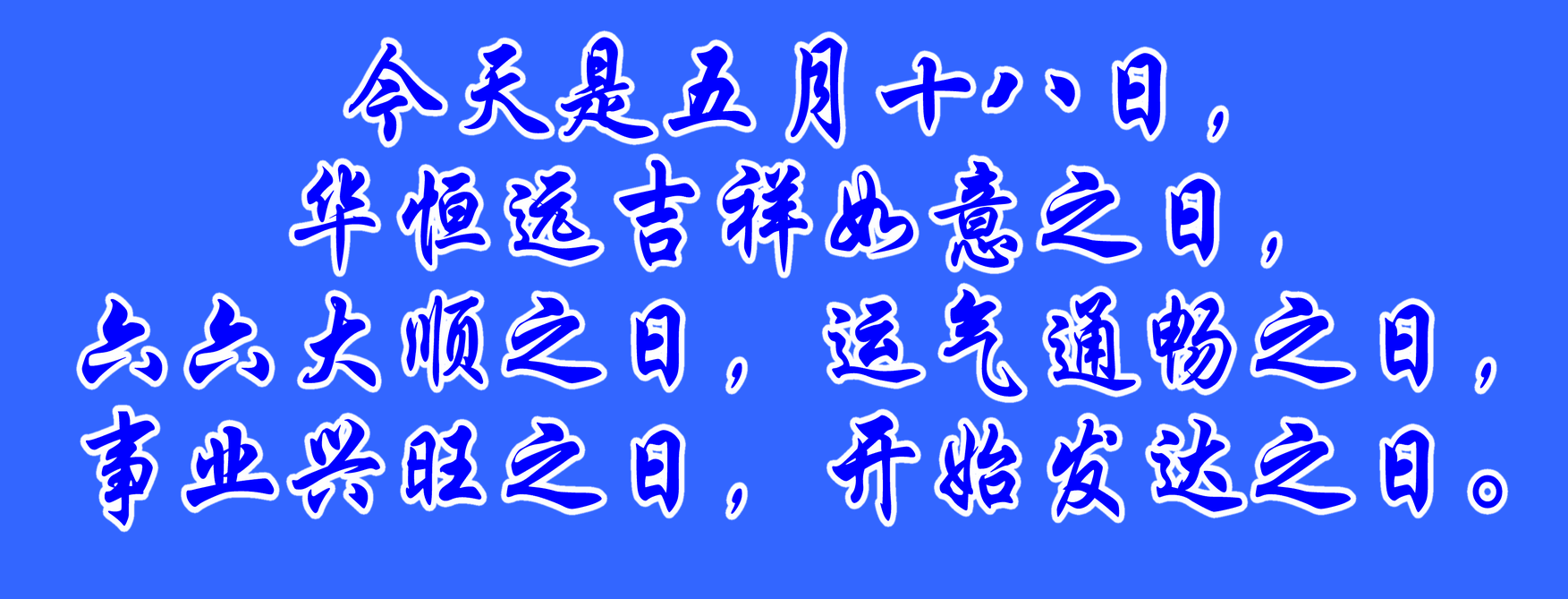 今天是五月十八日,乐天堂fun88吉祥如意之日,六六大顺之日,运气通畅之日,事业兴旺之日,开始发达之日。