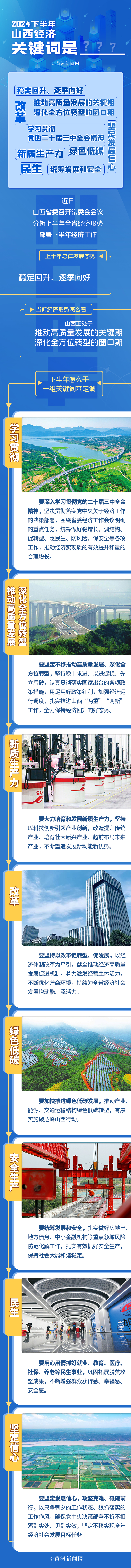 会议指出,上半年,全省经济总体呈现稳定回升、逐季向好的发展态势,经济社会发展各项工作扎实推进,高质量发展迈出新的步伐。当前,我省正处于推动高质量发展的关键期、深化全方位转型的窗口期。要深入学习贯彻党的二十届三中全会精神,坚决贯彻落实党中央关于经济工作的决策部署,围绕省委经济工作会议明确的重点任务,统筹做好稳增长、调结构、促转型、惠民生、防风险、保安全等各项工作,推动经济实现质的有效提升和量的合理增长。要坚定不移推动高质量发展、深化全方位转型,坚持稳中求进、以进促稳、先立后破,认真贯彻落实国家出台的各项政策措施,用足用好政策红利,加强经济运行调度,扎实推进我省“两重”“两新”工作,全力保持经济回升向好态势。要大力培育和发展新质生产力,坚持以科技创新引领产业创新,改造提升传统产业、培育壮大新兴产业、超前布局未来产业,不断塑造发展新动能新优势。要坚持以改革促转型、促发展,以经济体制改革为牵引,健全推动经济高质量发展促进机制,着力激发经营主体活力,不断优化营商环境,持续为全省经济社会发展增动能、添活力。要加快推进绿色低碳发展,推动产业、能源、交通运输结构绿色低碳转型,有序实施碳达峰山西行动。要统筹发展和安全,扎实做好房地产、地方债务、中小金融机构等重点领域风险防范化解工作,扎实有效抓好安全生产,保持社会大局和谐稳定。要用心用情抓好就业、教育、医疗、社保、养老等民生事业,巩固拓展脱贫攻坚成果,不断增强群众获得感、幸福感、安全感。要坚定发展信心,攻坚克难、砥砺前行,以只争朝夕的工作状态、狠抓落实的工作作风,确保党中央决策部署不折不扣落到实处、见到实效,坚定不移实现全年经济社会发展目标任务。