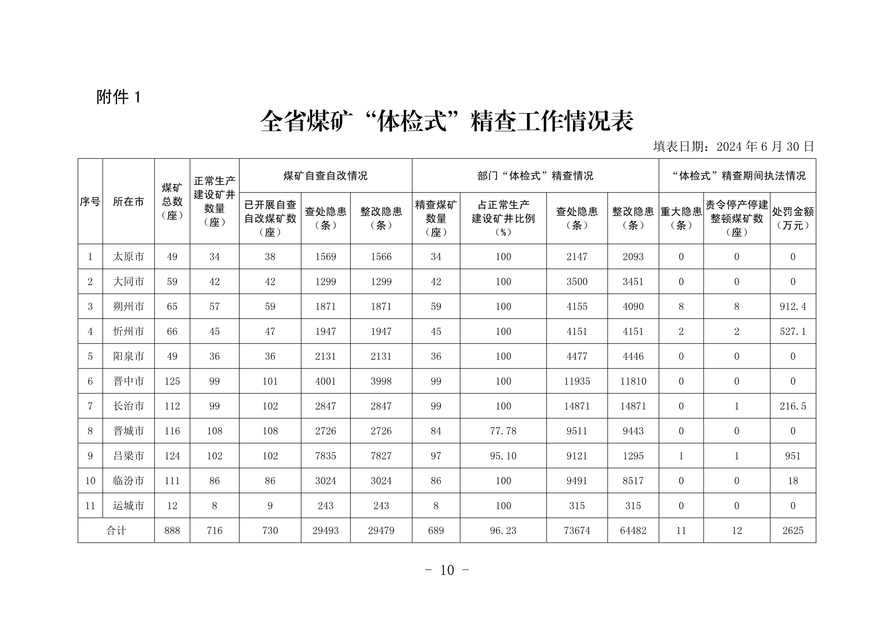 煤矿方面,到 2024 年 6 月底,各市共对689 座正常生产建设煤矿进行了“体检式”精查,完成率96.23%。共查处问题隐患 73674 条,已整改 64482 条,整改率87.52%。各市“体检式”精查完成情况为:太原市 100%、大同市100%、朔州市100%、忻州市 100%、阳泉市 100%、晋中市100%、长治市100%、临汾市100%、运城市 100%、吕梁市 95.1%、晋城市77.78%。