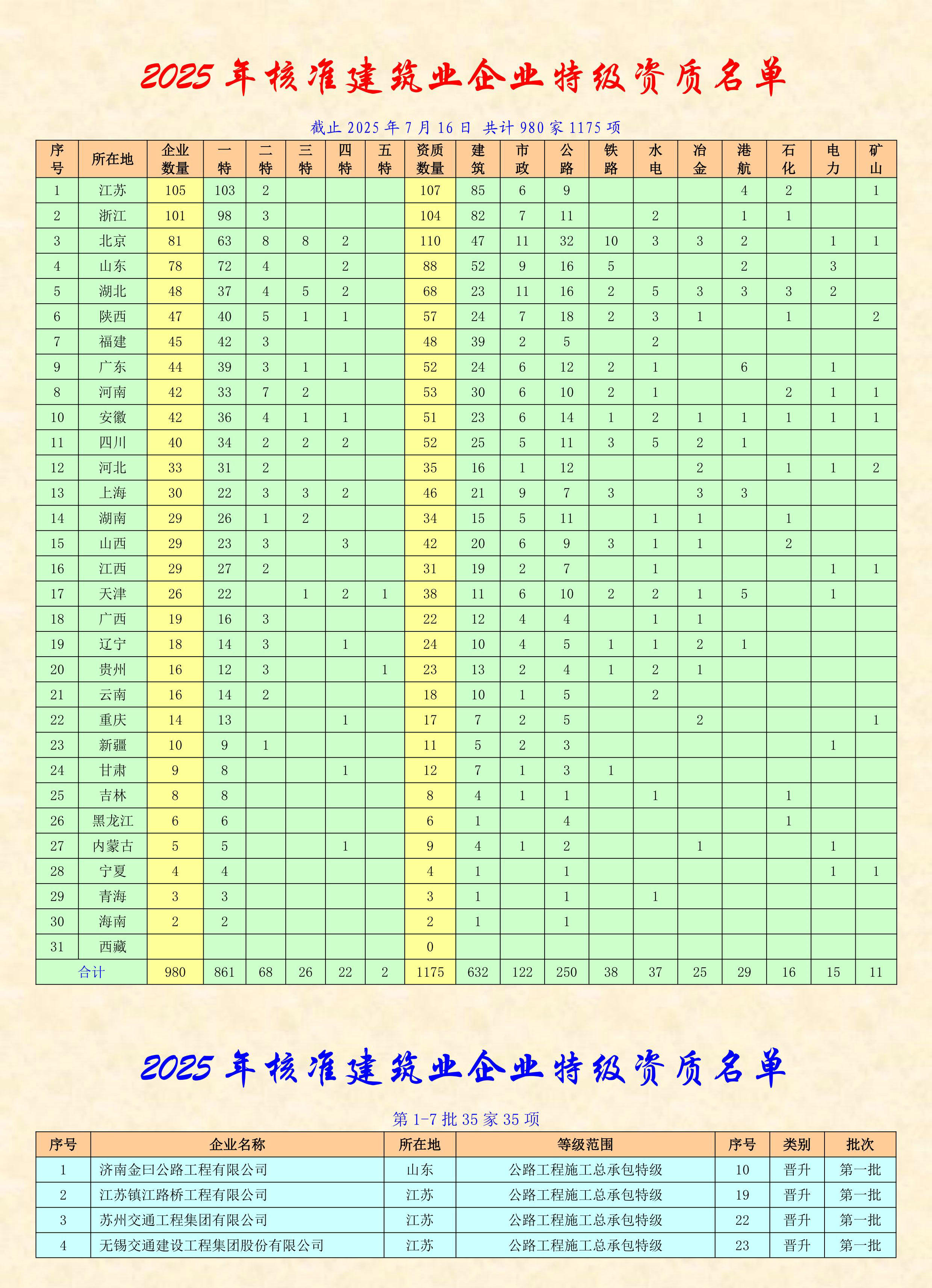 根据《中华人民共和国建筑法》及有关建设工程企业资质管理规定,现将我部核准的工程勘察资质、工程设计资质、建筑业企业资质、工程监理企业资质的单位名单(2025年度第七批)予以公布。未予核准的单位可登录住房城乡建设部政务服务门户,点击“申请事项办理进度查询(受理发证信息查询)”栏目查询原因。