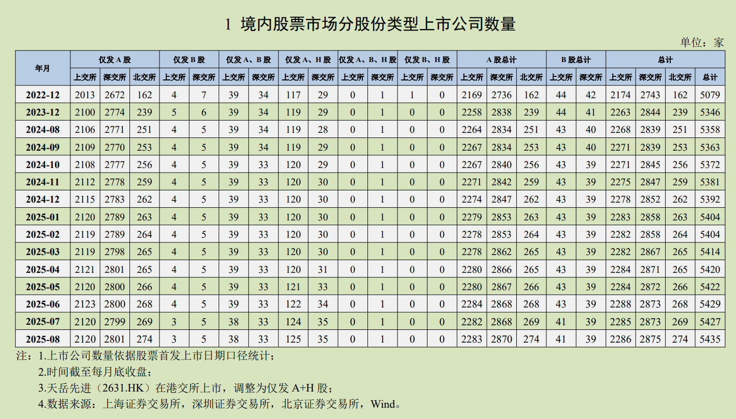 中国上市公司协会最新发布的数据显示,截至2025年8月31日,境内股票市场共有上市公司5435家,沪、深、北证券交易所分别为2286、2875、274家。