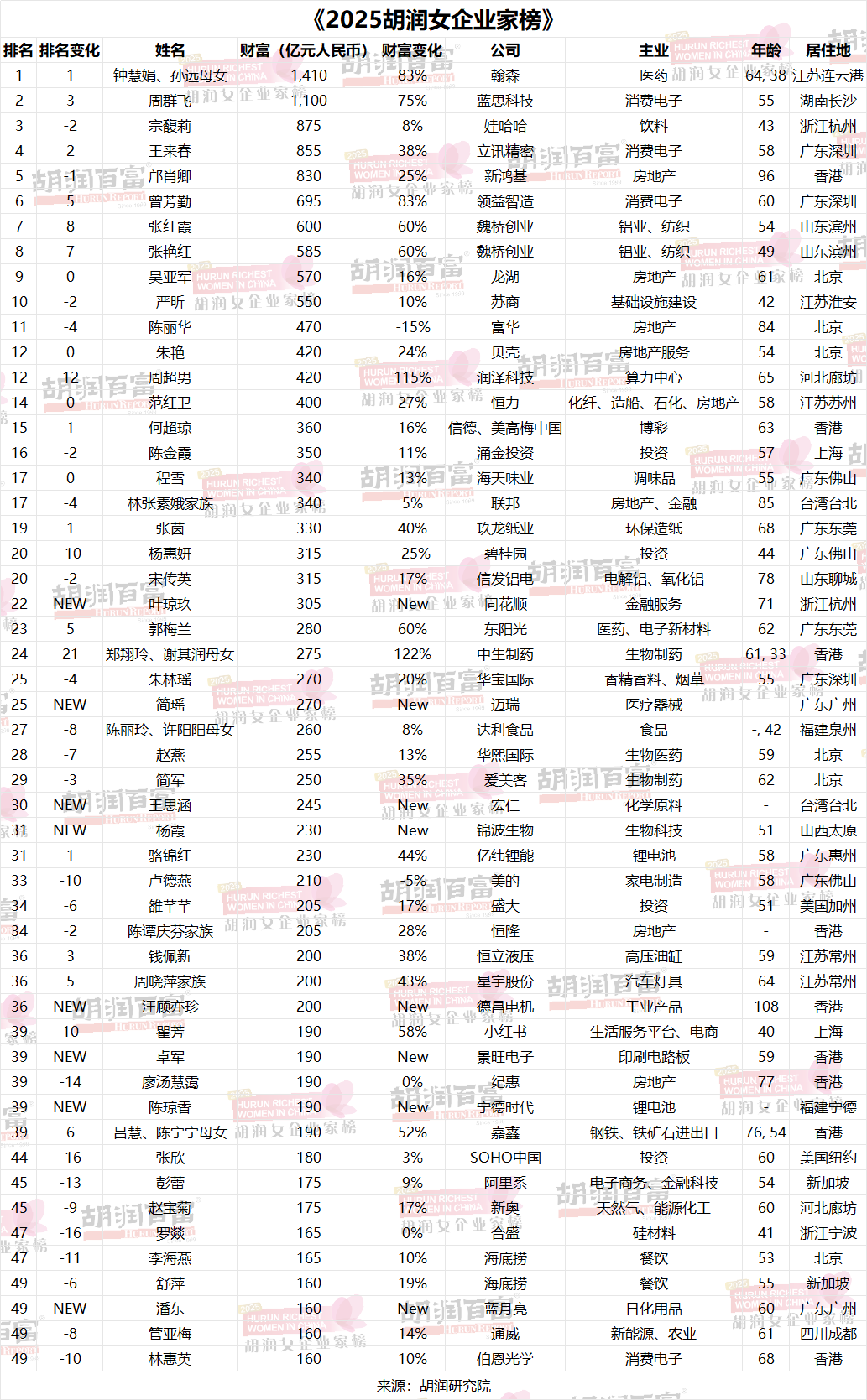 胡润研究院发布《2025胡润女企业家榜》