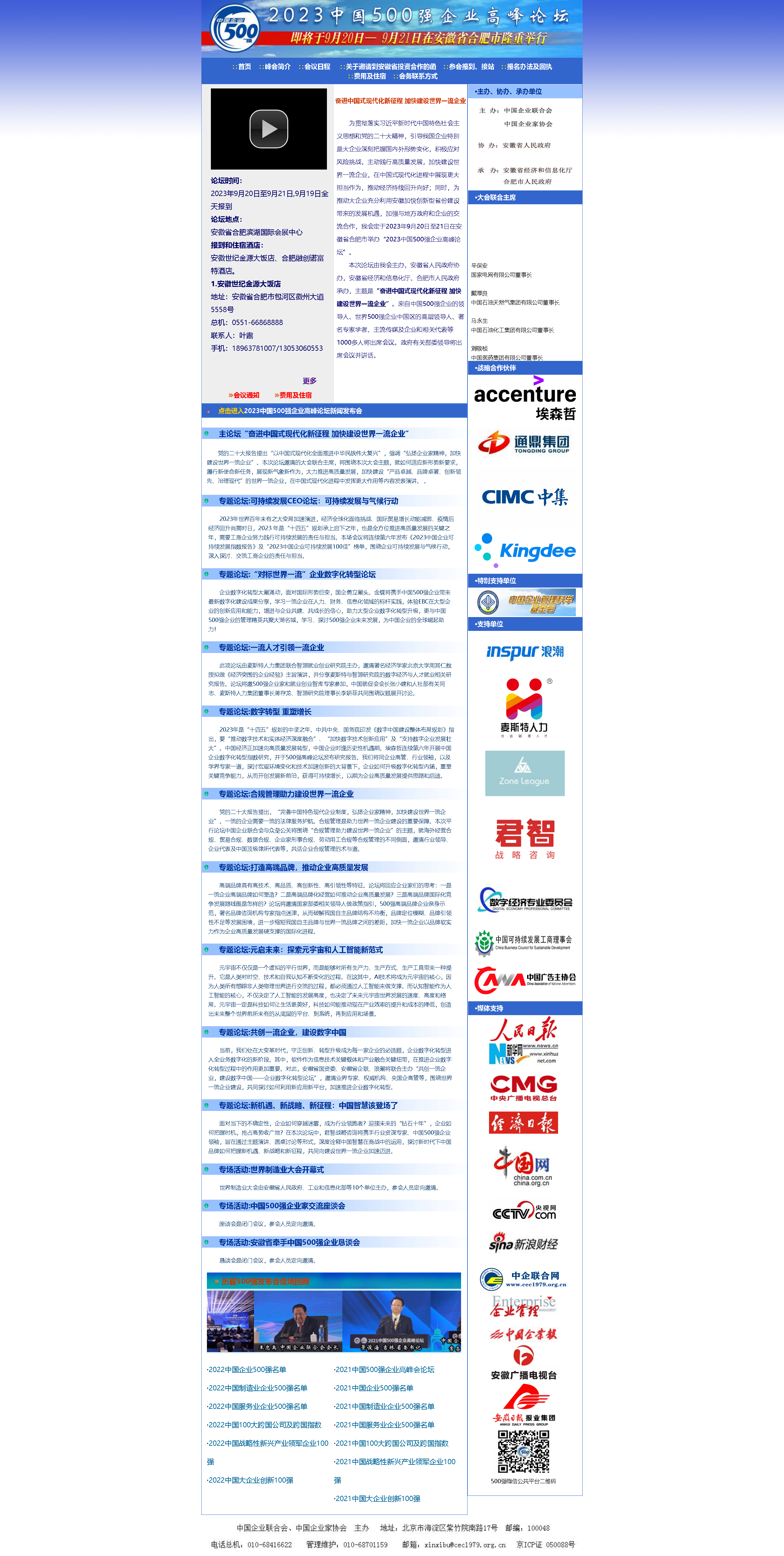 为贯彻落实习近平新时代中国特色社会主义思想和党的二十大精神,引导我国企业特别是大企业深刻把握国内外形势变化,积极应对风险挑战,主动践行高质量发展,加快建设世界一流企业,在中国式现代化进程中展现更大担当作为,推动经济持续回升向好;同时,为推动大企业充分利用安徽加快创新型省份建设带来的发展机遇,加强与地方政府和企业的交流合作,我会定于2023年9月20日至21日在安徽省合肥市举办“2023中国500强企业高峰论坛”。 本次论坛由我会主办,安徽省人民政府协办,安徽省经济和信息化厅、合肥市人民政府承办,主题是“奋进中国式现代化新征程 加快建设世界一流企业”。来自中国500强企业的领导人、世界500强企业中国区的高层领导人、著名专家学者、主流传媒及企业和相关代表等1000多人将出席会议。政府有关部委领导将出席会议并讲话。