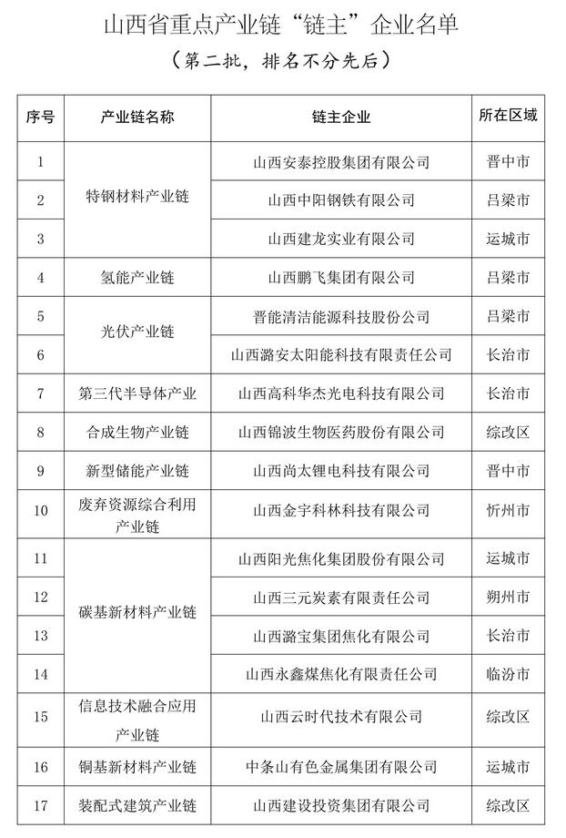 近日,山西省工信厅发布第二批山西省重点产业链“链主”企业公示名单,此次共有17家企业“上榜”,共涉及11条重点产业链。
