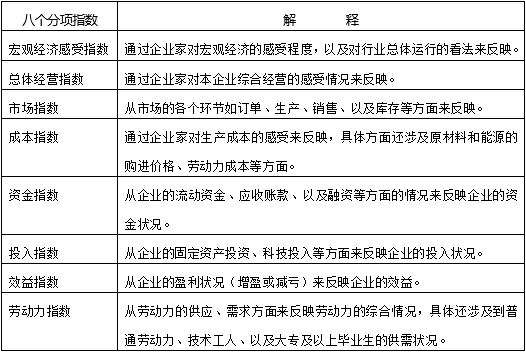 在行业选取的过程中,依据国民经济各行业对GDP的贡献度,共选取了工业、建筑业、交通运输邮政仓储业、房地产业、批发零售业、社会服务业、信息传输计算机服务和软件业、住宿餐饮业等八大行业。每个行业的调查内容,具体包括八个大的分项:宏观经济感受、总体经营、市场、成本、资金、投入、效益、劳动力。在具体调查过程中,考虑到不同行业的特点,八个大的分项里面的细项调查有所区别。