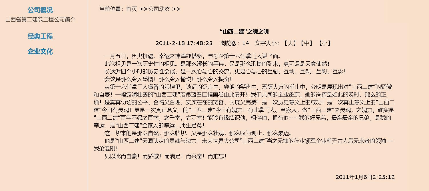 山西二建集团有限公司是我的母亲,我是她忠诚的儿子,永远陪伴老妈妈一生一世,永不分离!让她的胸怀和抱负释放,帮助更多的行业同仁得到成功的经验和机遇,这就是不折不扣执行母亲的愿望,把乐天堂fun88推上发展的快车道,实现实业报国之心之志,为中华民族伟大复兴的中国梦早日实现奉献一个企业家的使命和担当!