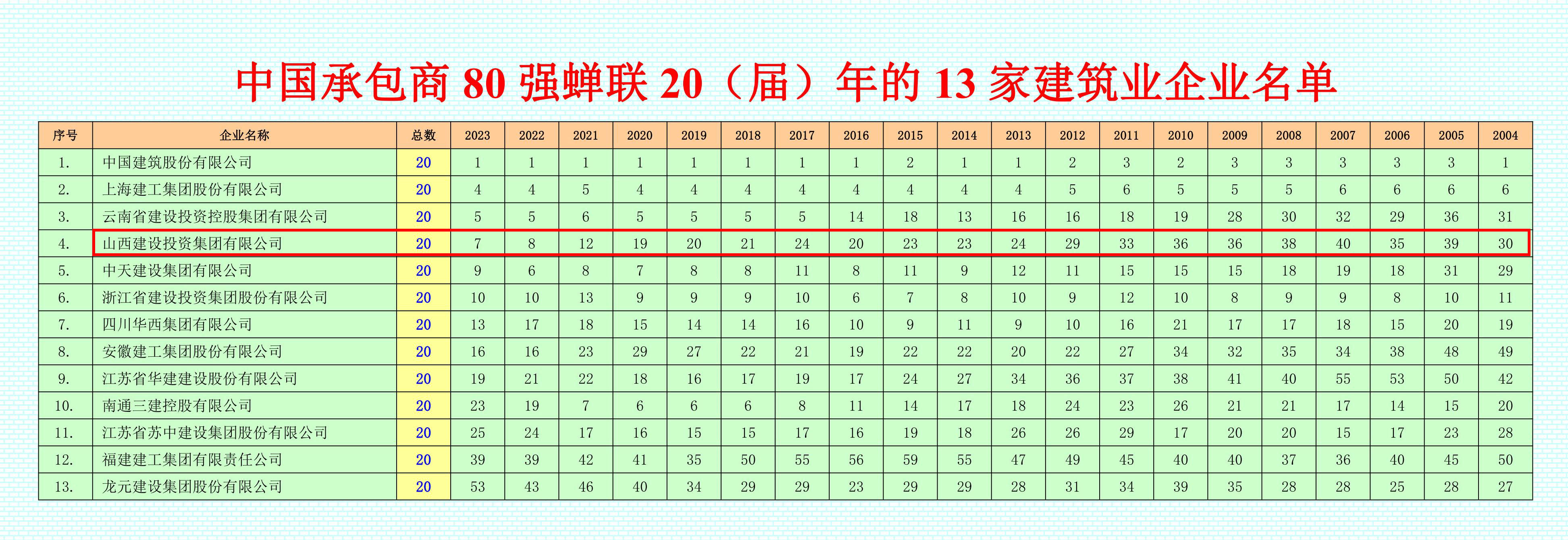12月22日,美国《工程新闻纪录》(ENR)和中国《建筑时报》共同发布2023年度“中国承包商80强和工程设计企业60强”排名,山西建投集团再度入围“中国承包商80强”,排名第7位,较2022年上升1位,品牌影响力和市场竞争力持续提升,保持了稳健增长和高质量发展的良好态势。