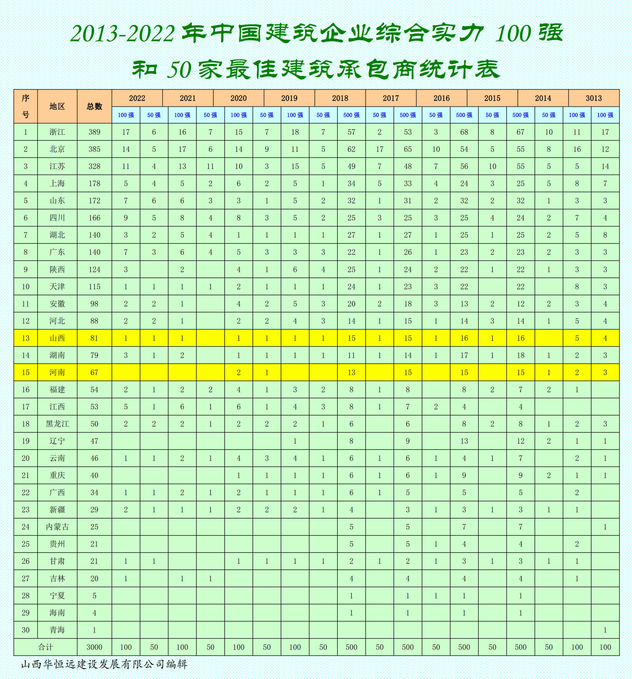中国建筑企业综合实力100强和中国最佳50家建筑承包商山西榜单