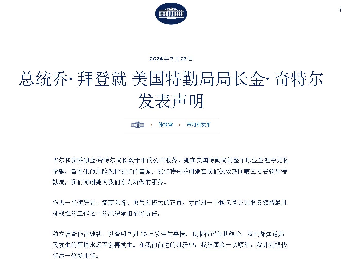 美国总统拜登23日发表声明,感谢奇特尔在职期间为国家作出的贡献,并表示“未遂刺杀”事件独立审查工作仍在继续,他将很快任命新的特勤局局长。美国国土安全部长马约卡斯随后在一份声明中宣布,特勤局副局长罗纳德·罗已被任命为特勤局代理局长。