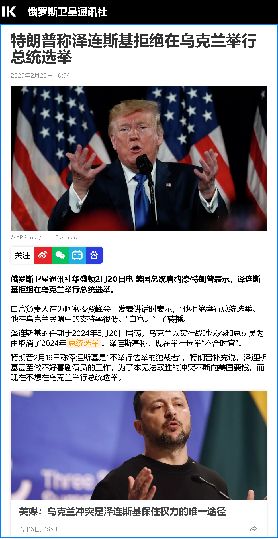 美国总统特朗普19日在佛罗里达州一场会议上说,乌克兰总统泽连斯基是 “独裁者”。他警告说,泽连斯基必须迅速采取行动以实现和平,否则将面临失去国家的风险。