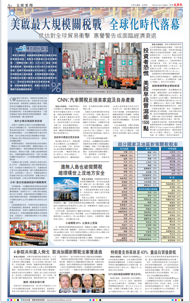 美國總統特朗普昨日發動史無前例的關稅戰,向全世界主要國家徵收巨額關稅。此舉進一步暴露其霸權主義的真面目,遭到包括其盟友在內所有國家的一致強烈反對。美股昨晚一度大跌1600點,足以體現市場的態度。面對美國的野蠻霸道行徑,中國將採取必要措施堅定維護自身權益。對香港特區來說,挑戰和機遇並存,既要正視美關稅戰帶來的衝擊,更要堅定發展信心,加快融入國家發展大局,加大開拓新市場的力度,提升應對風浪的能力。