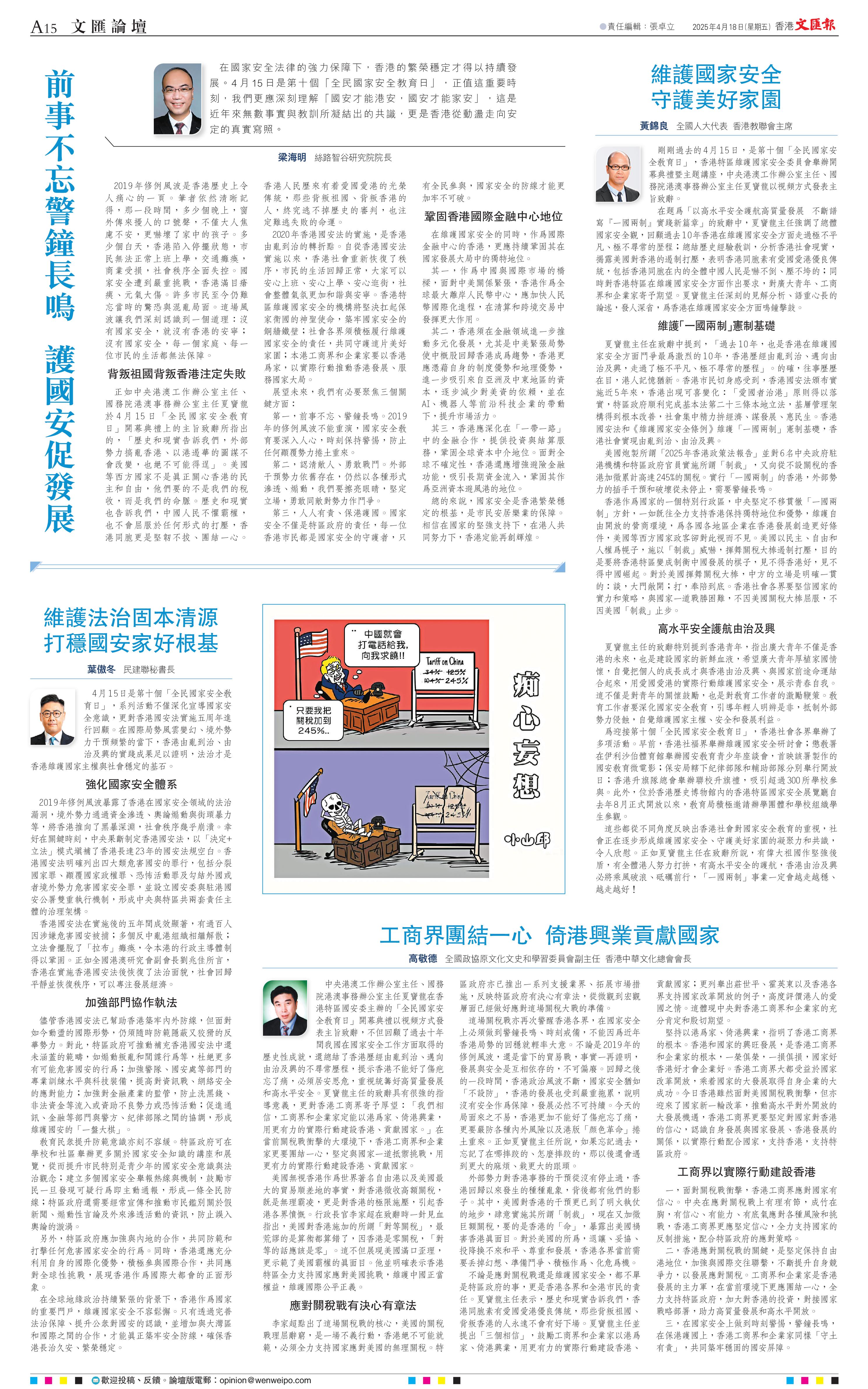 中央港澳工作办公室主任、国务院港澳事务办公室主任夏宝龙在香港特区国安委主办的「全民国家安全教育日」开幕典礼以视频方式发表主旨致辞,不但回顾了过去十年间我国在国家安全工作方面取得的历史性成就,还总结了香港历经由乱到治、迈向由治及兴的不寻常历程,提示香港不能好了伤疤忘了痛,必须居安思危,重视统筹好高质量发展和高水平安全。夏宝龙主任的致辞具有很强的指导意义,更对香港工商界寄予厚望:「我们相信,工商界和企业家定能以港为家、倚港兴业,用更有力的实际行动建设香港、贡献国家。」在当前关税战冲击的大环境下,香港工商界和企业家更要团结一心,坚定与国家一道抵御挑战,用更有力的实际行动建设香港、贡献国家。