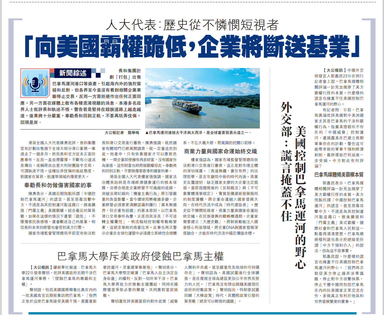陈勇表示,美国近期炮制所谓「中国控制巴拿马运河」的谎言,甚至恶毒攻击中方,不过是为其控制运河制造借口,推进扩张「门罗主义」美国霸权。结合最近的贸易战,如果在这样的情况下还要「跪低」,不仅伤害民族感情,还会断送自己的基业,相信长和未来的经营也会受到美方打压。