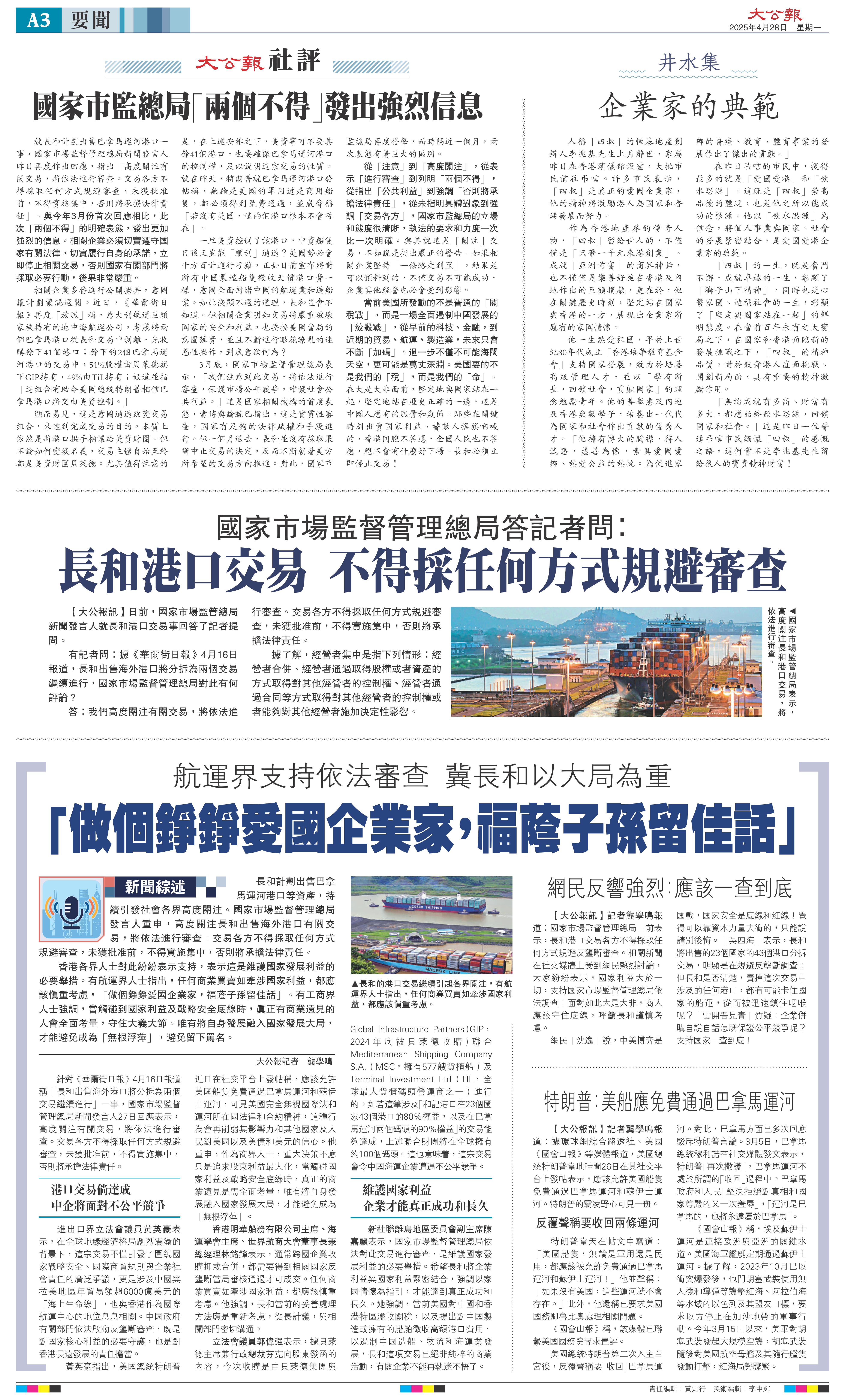 【大公报讯】记者龚学鸣报道:国家市场监督管理总局日前表示,长和港口交易各方不得采取任何方式规避反垄断审查。相关新闻在社交媒体上受到网民热烈讨论,大家纷纷表示,国家利益大于一切,支持国家市场监督管理总局依法调查!面对如此大是大非,商人应该守住底线,呼吁长和谨慎考虑。