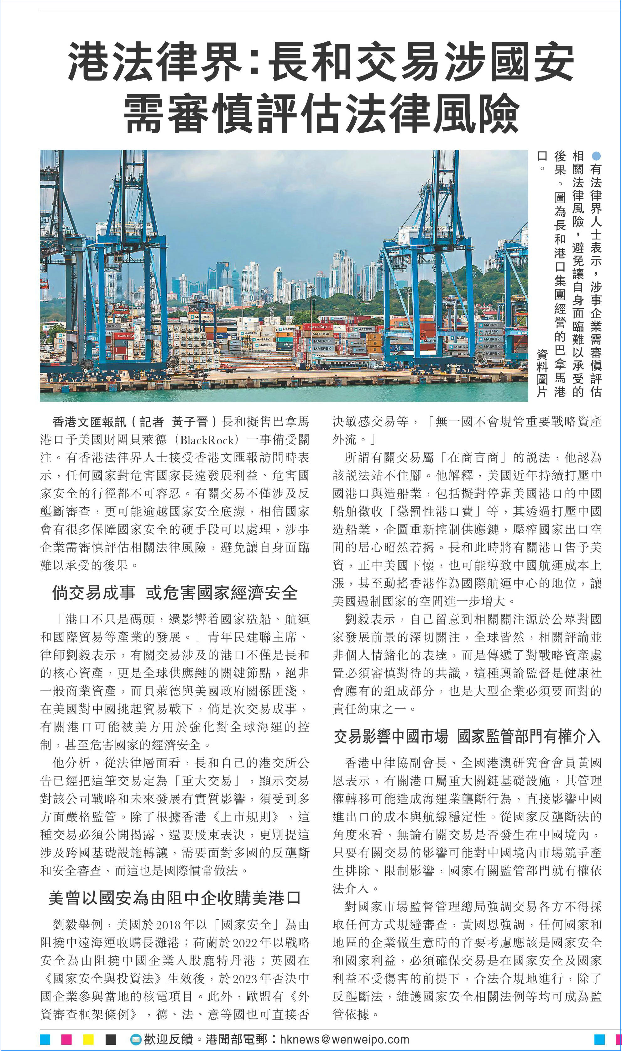 「港口不只是码头,还影响着国家造船、航运和国际贸易等产业的发展。」青年民建联主席、律师刘毅表示,有关交易涉及的港口不仅是长和的核心资产,更是全球供应链的关键节点,绝非一般商业资产,而贝莱德与美国政府关系匪浅,在美国对中国挑起贸易战下,倘是次交易成事,有关港口可能被美方用于强化对全球海运的控制,甚至危害国家的经济安全。