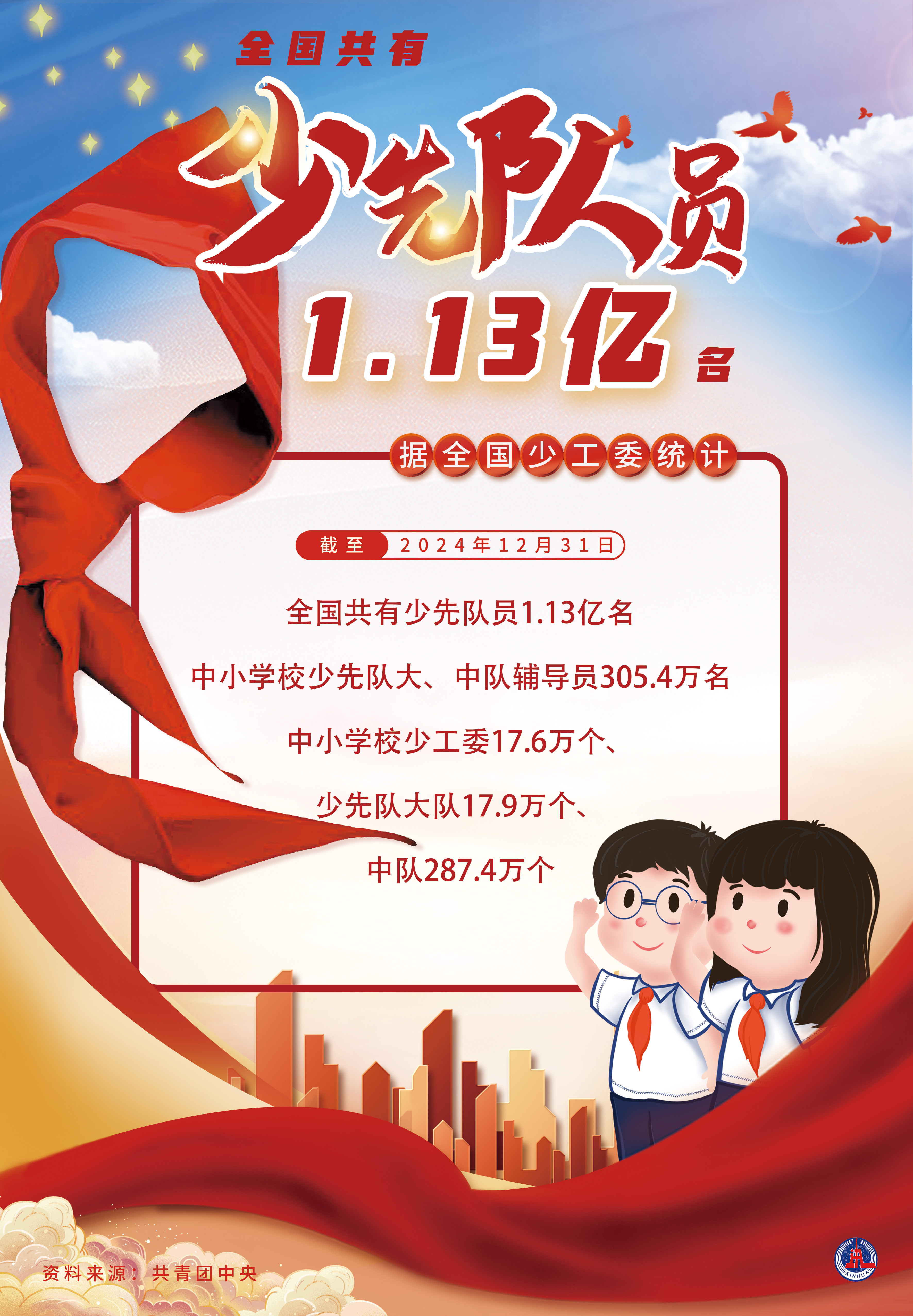 新华社北京5月31日电 记者31日从共青团中央获悉,据全国少工委统计,截至2024年12月31日,全国共有少先队员1.13亿名,中小学校少先队大、中队辅导员305.4万名。中小学校少工委17.6万个、少先队大队17.9万个、中队287.4万个。