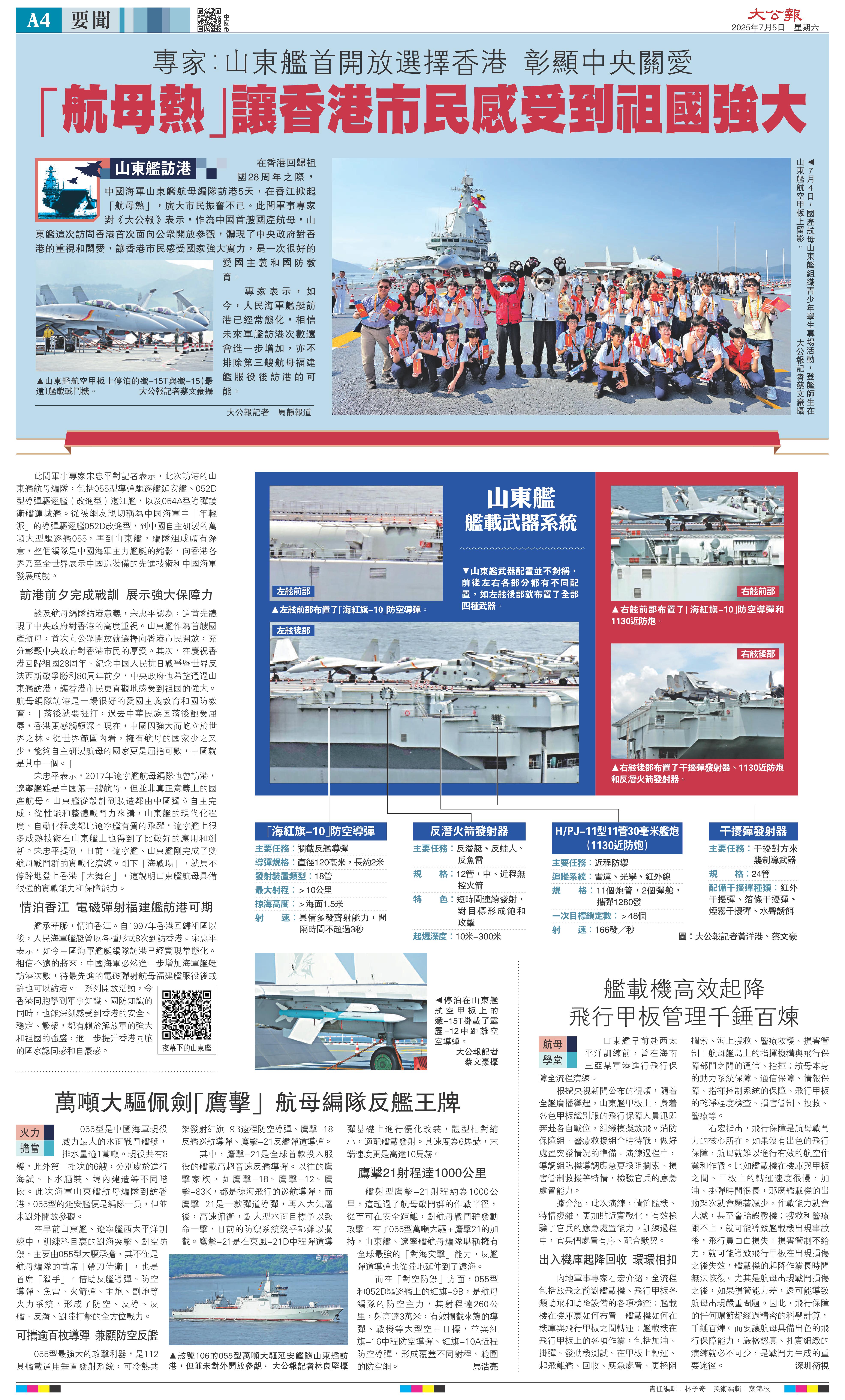 在香港回归祖国28周年之际,中国海军山东舰航母编队访港5天,在香江掀起「航母热」,广大市民振奋不已。此间军事专家对《大公报》表示,作为中国首艘国产航母,山东舰这次访问香港首次面向公众开放参观,体现了中央政府对香港的重视和关爱,让香港市民感受国家强大实力,是一次很好的爱国主义和国防教育。