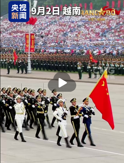 应越南国防部邀请,中国人民解放军仪仗司礼大队抽组仪仗分队,参加越南今天(9月2日)举行的八月革命暨越南国庆80周年纪念活动。中国军人整齐的步伐和昂扬的军姿赢得了越南民众的喝彩。除中国外,俄罗斯、柬埔寨、老挝、古巴和白俄罗斯等国部队也受邀参加阅兵式。