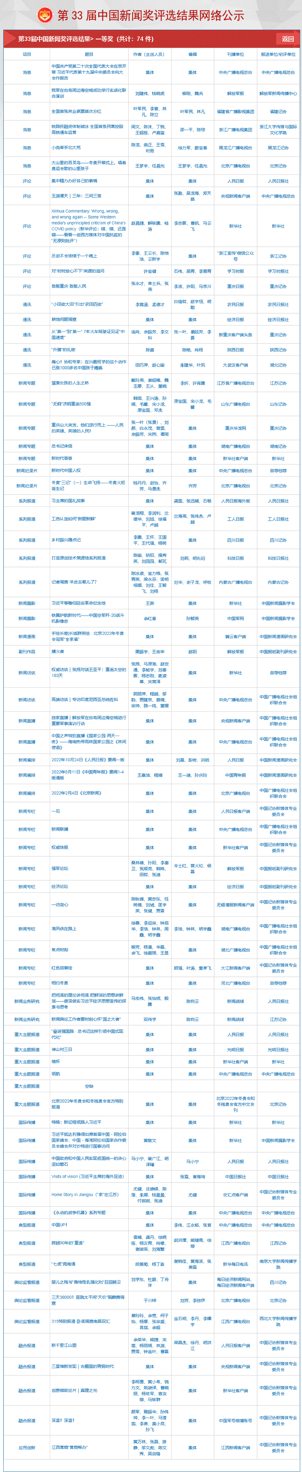 新华社北京9月20日电 自9月20日起,中国记协在中国记协微信公众号、中国记协网公示第三十三届中国新闻奖评选结果。本届中国新闻奖共评选出378件拟获奖作品,其中特别奖3件、一等奖74件、二等奖114件、三等奖187件。同时公示的还有本届《中国新闻奖评选细则》和评委名单。