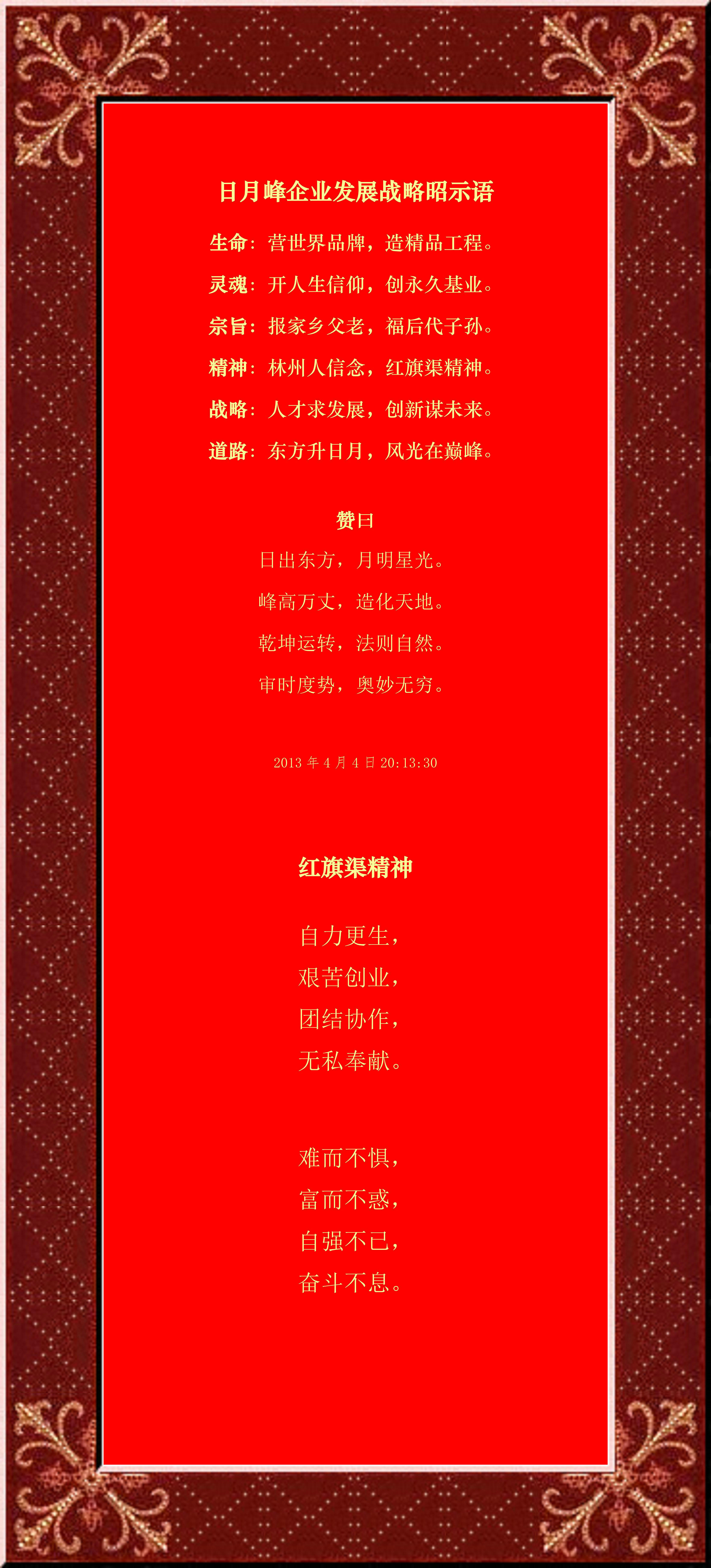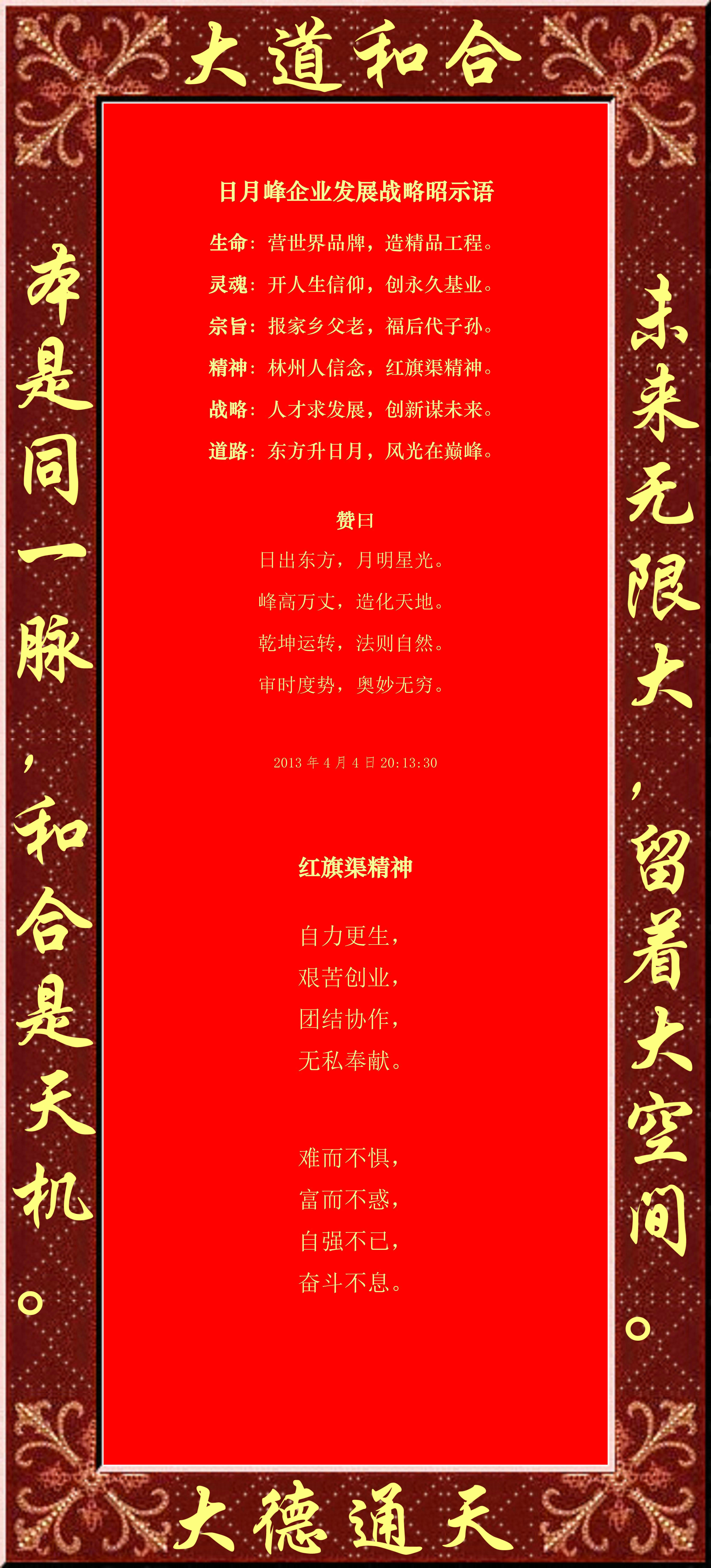 这是十二年前给日月峰制定的公司发展战略昭示语,发表在山西日月峰建筑工程有限公司网站企业文化栏目上。