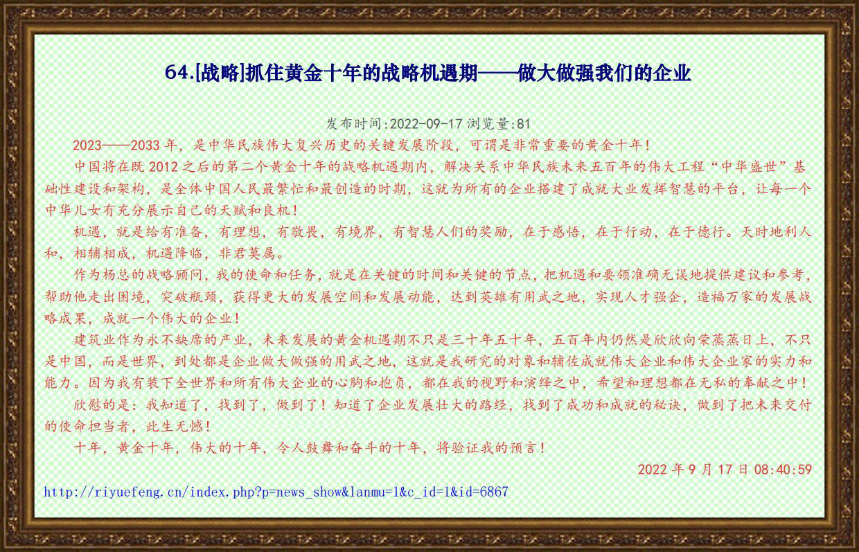 建筑业作为永不缺席的产业,未来发展的黄金机遇期不只是三十年五十年,五百年内仍然是欣欣向荣蒸蒸日上,不只是中国,而是世界,到处都是企业做大做强的用武之地,这就是我研究的对象和辅佐成就伟大企业和伟大企业家的实力和能力。因为我有装下全世界和所有伟大企业的心胸和抱负,都在我的视野和演绎之中,希望和理想都在无私的奉献之中!