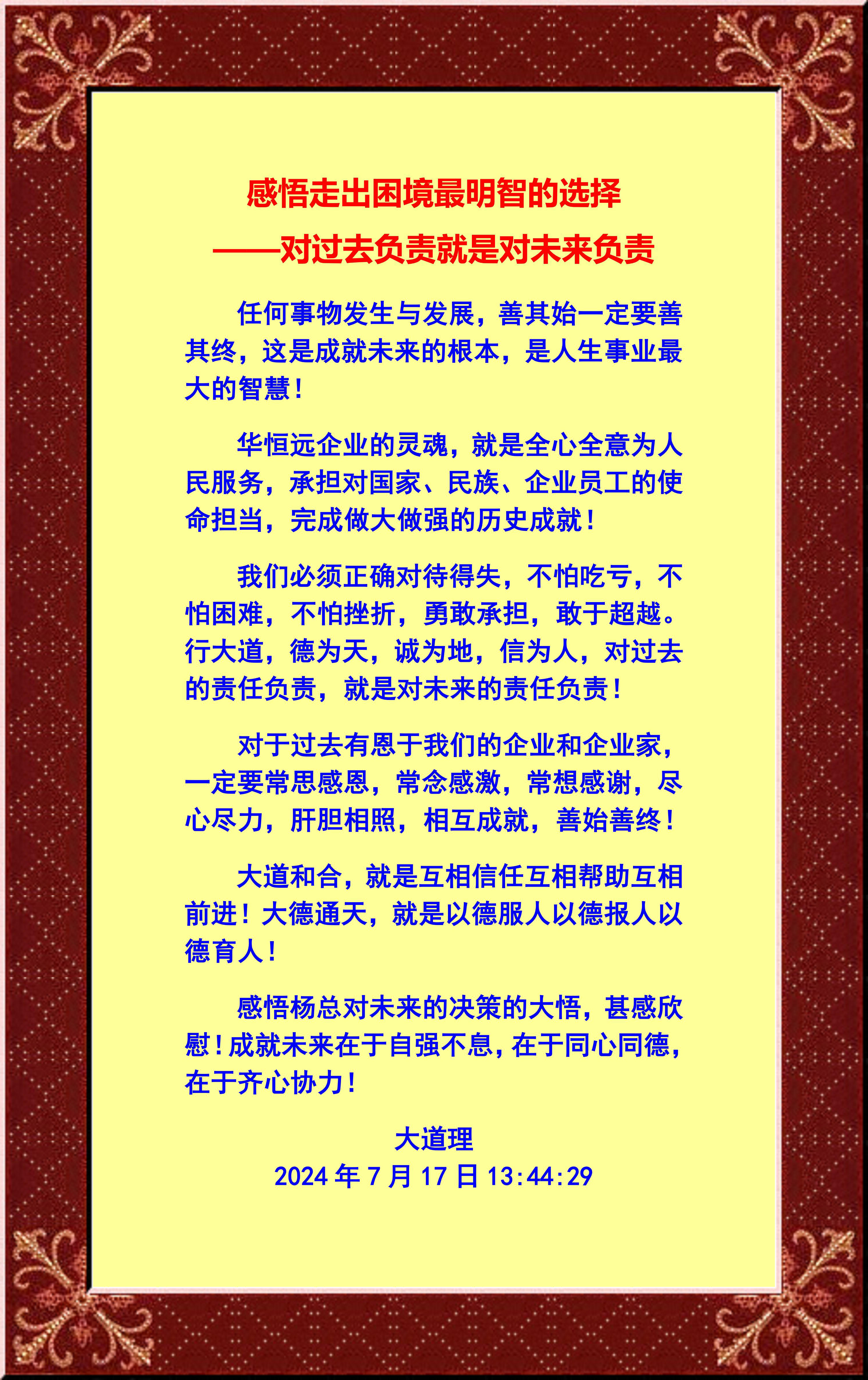 感悟杨总对未来的决策的大悟,甚感欣慰!成就未来在于自强不息,在于同心同德,在于齐心协力!