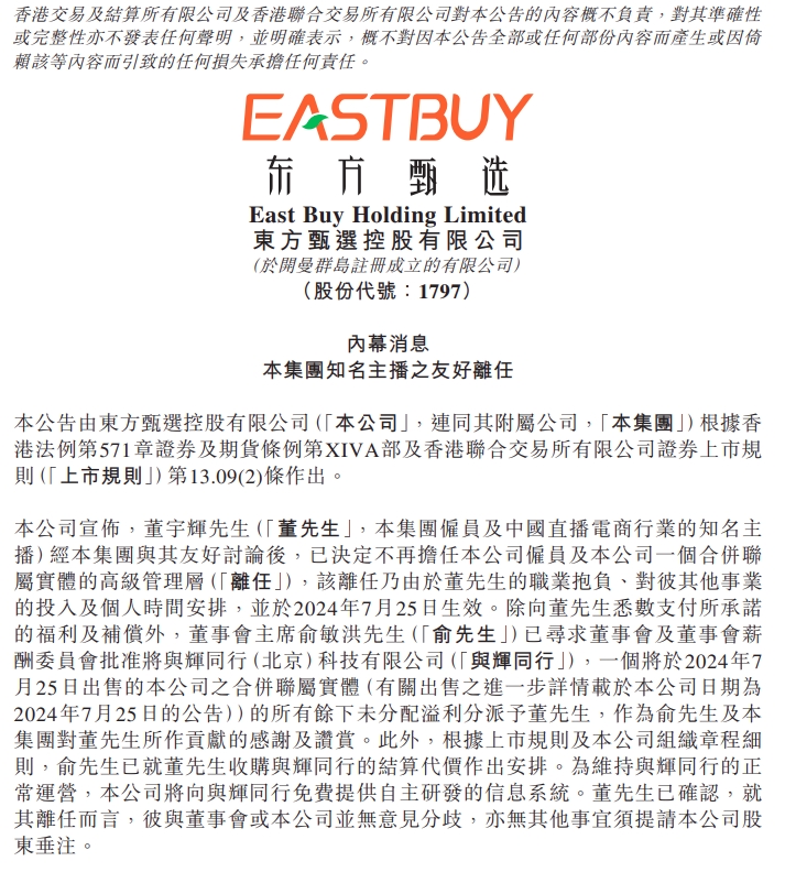 天天消费讯,7月25日,东方甄选在港交所公告,董宇辉已决定不再担任公司雇员及公司一个合并联属实体的高级管理层,该离任乃由于董宇辉的职业抱负、对彼其他事业的投入及个人时间安排,并于2024年7月25日生效。
