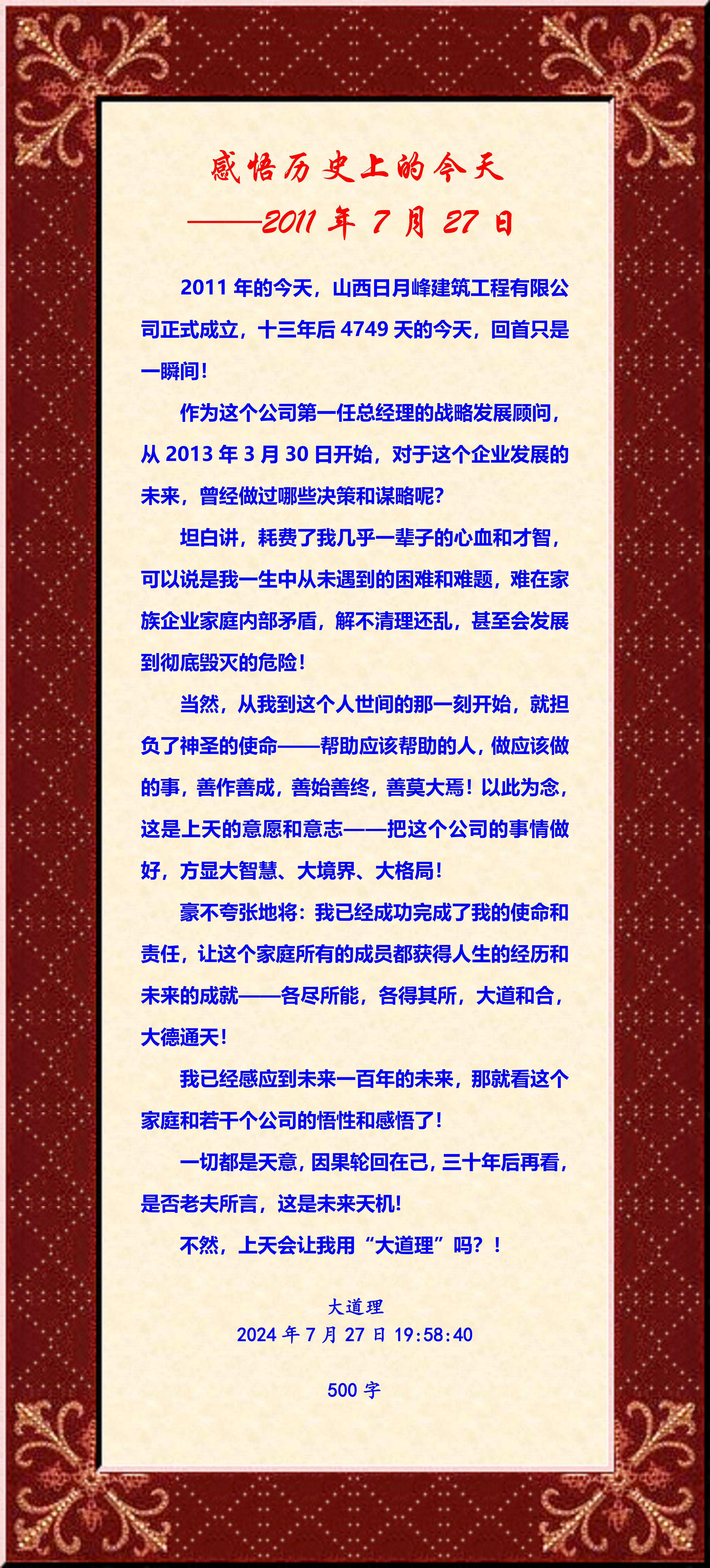 2011年的今天,山西日月峰建筑工程有限公司正式成立,十三年后4749天的今天,回首只是一瞬间!