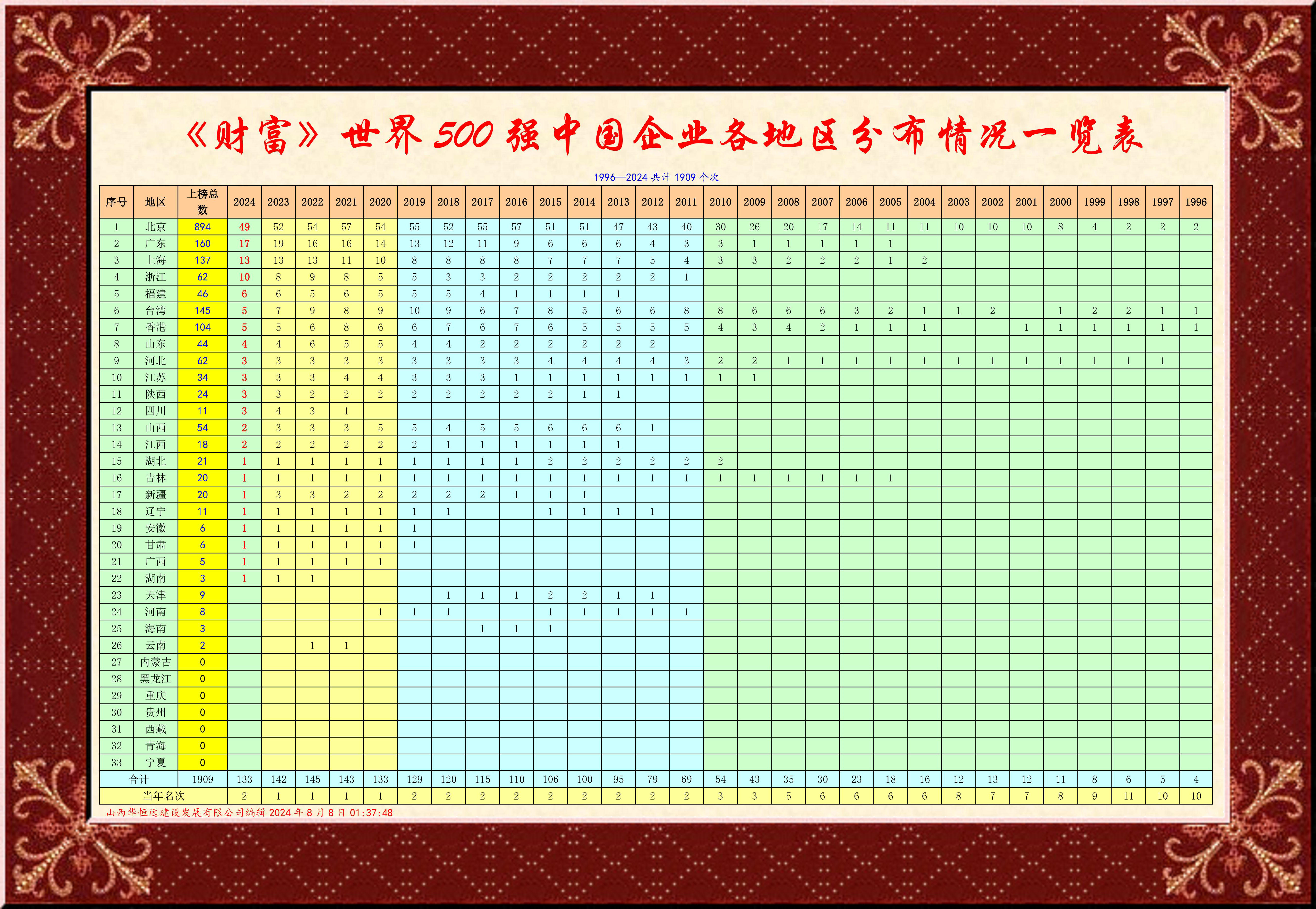 今年《财富》世界500强中国上榜企业133家,分布22个省(市)区,北京、广东、上海位居前三,分别为49、17和13家。 浙江创十四年最好水平达到10家。