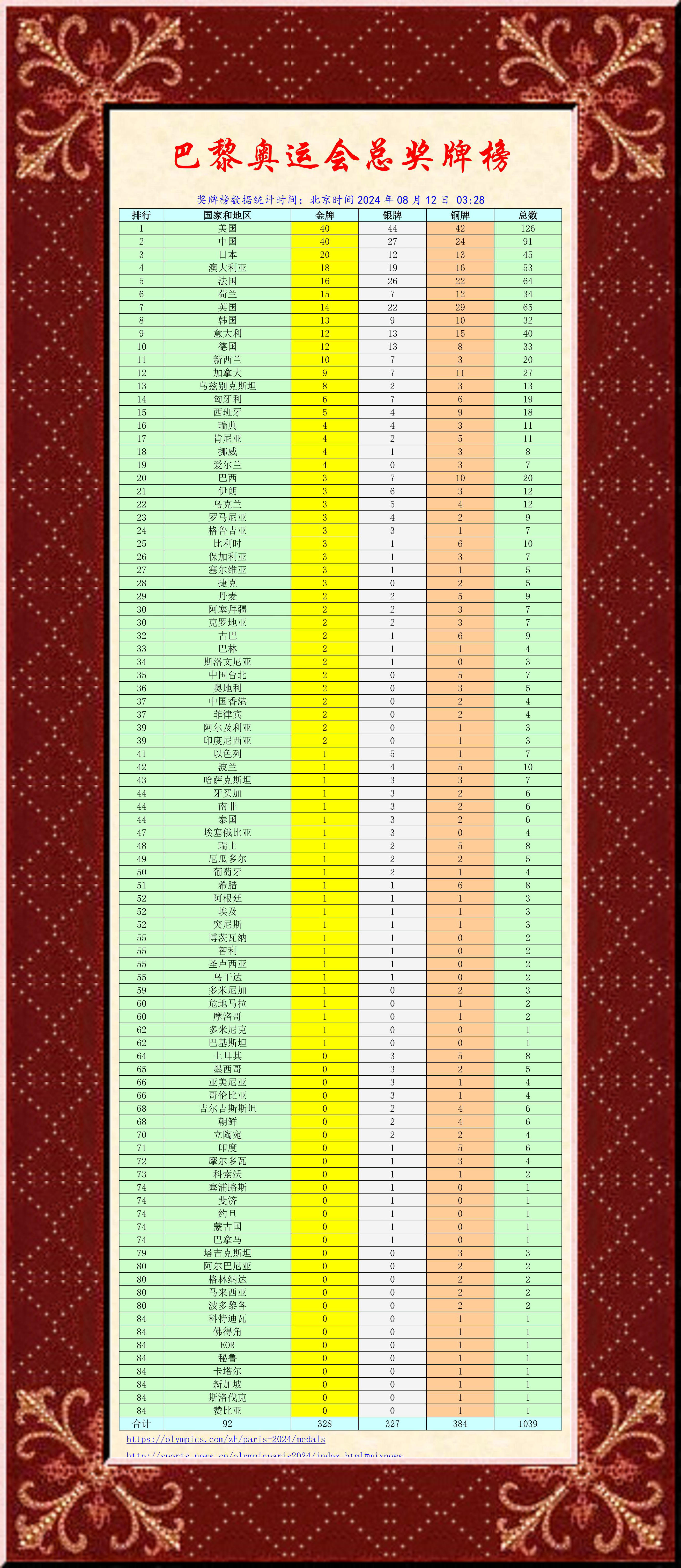 对中国体育代表团在巴黎奥运会上的表现,美国媒体也给予了极大关注,普遍有一种“难以想象”“不敢相信”的感觉。NBC11日发表的题为“中国队成为美国队最大的奥运对手”的报道称,“尽管美国在奖牌总数上占据主导地位,但就金牌数而言,中国已经与美国不相上下”。
