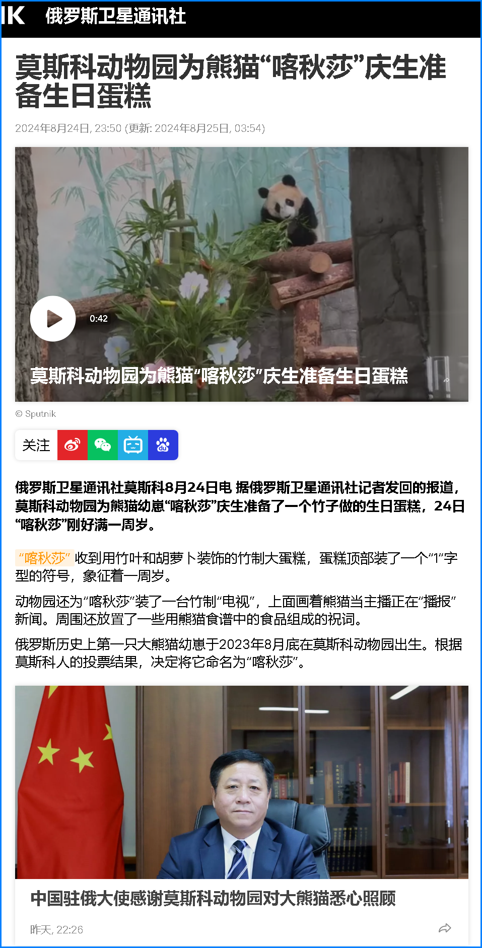 新华社莫斯科8月24日电 通讯丨在俄降生的首只大熊猫迎来周岁生日