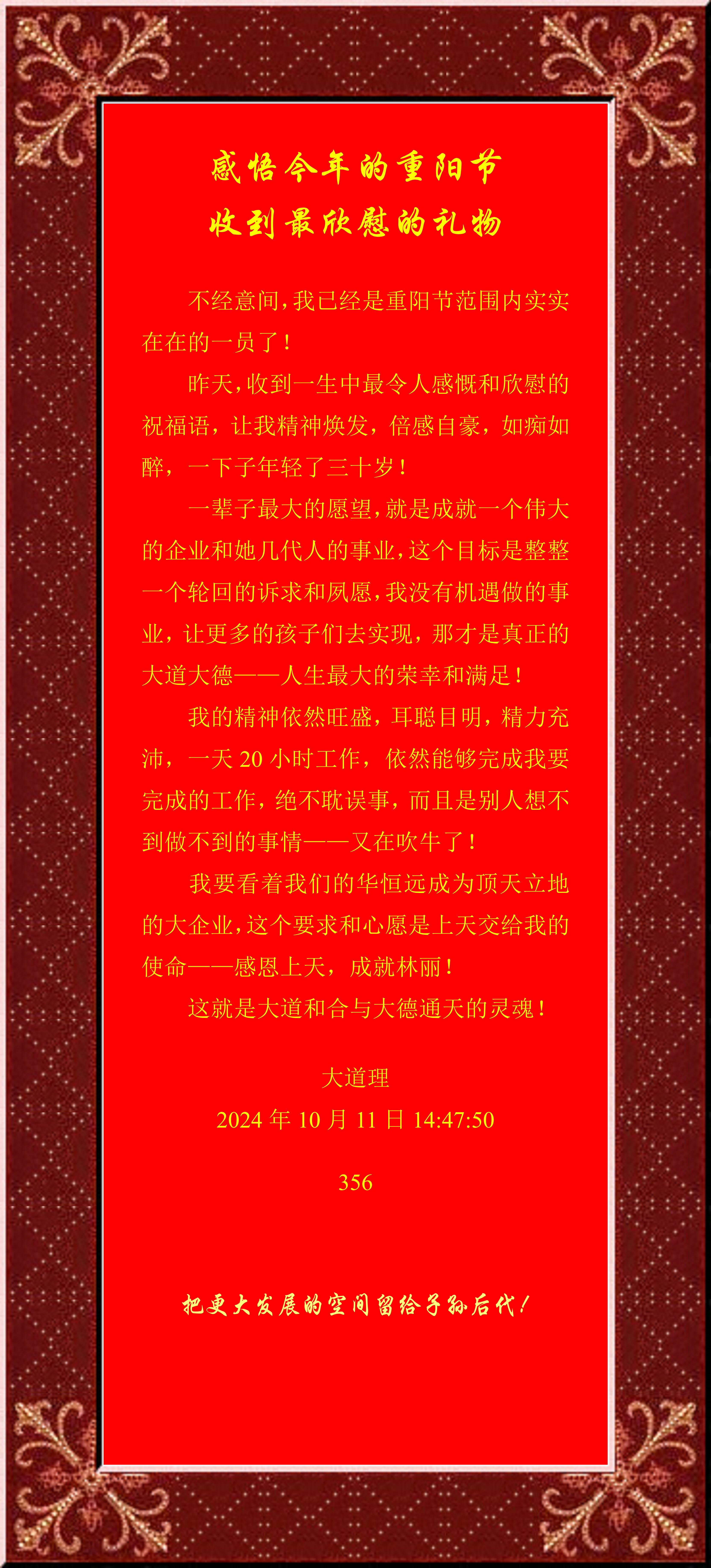 一辈子最大的愿望,就是成就一个伟大的企业和她几代人的事业,这个目标是整整一个轮回的诉求和夙愿,我没有机遇做的事业,让更多的孩子们去实现,那才是真正的大道大德——人生最大的荣幸和满足!