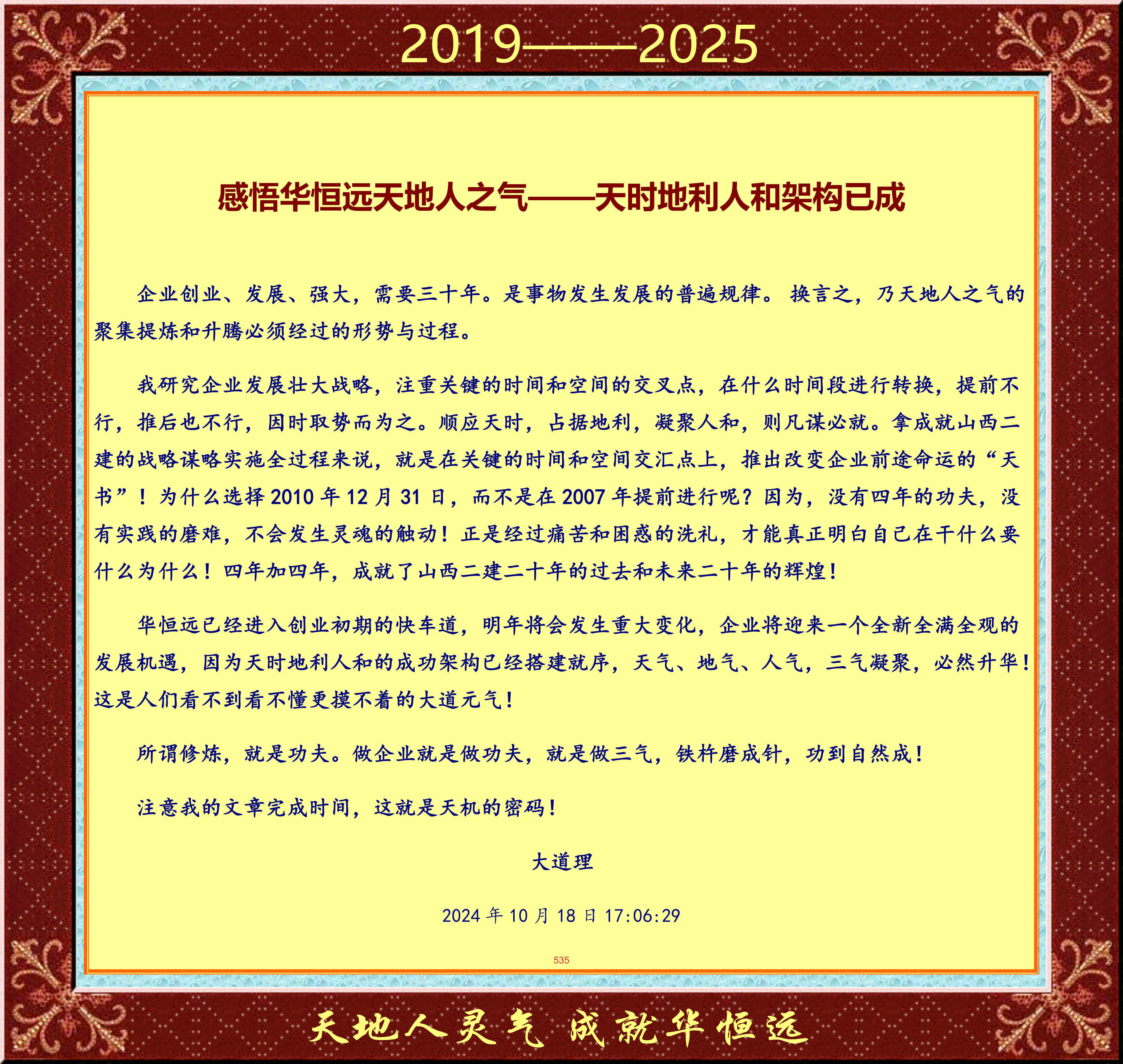 我研究企业发展壮大战略,注重关键的时间和空间的交叉点,在什么时间段进行转换,提前不行,推后也不行,因时取势而为之。顺应天时,占据地利,凝聚人和,则凡谋必就。拿成就山西二建的战略谋略实施全过程来说,就是在关键的时间和空间交汇点上,推出改变企业前途命运的“天书”!为什么选择2010年12月31日,而不是在2007年提前进行呢?因为,没有四年的功夫,没有实践的磨难,不会发生灵魂的触动!正是经过痛苦和困惑的洗礼,才能真正明白自己在干什么要什么为什么!四年加四年,成就了山西二建二十年的过去和未来二十年的辉煌!