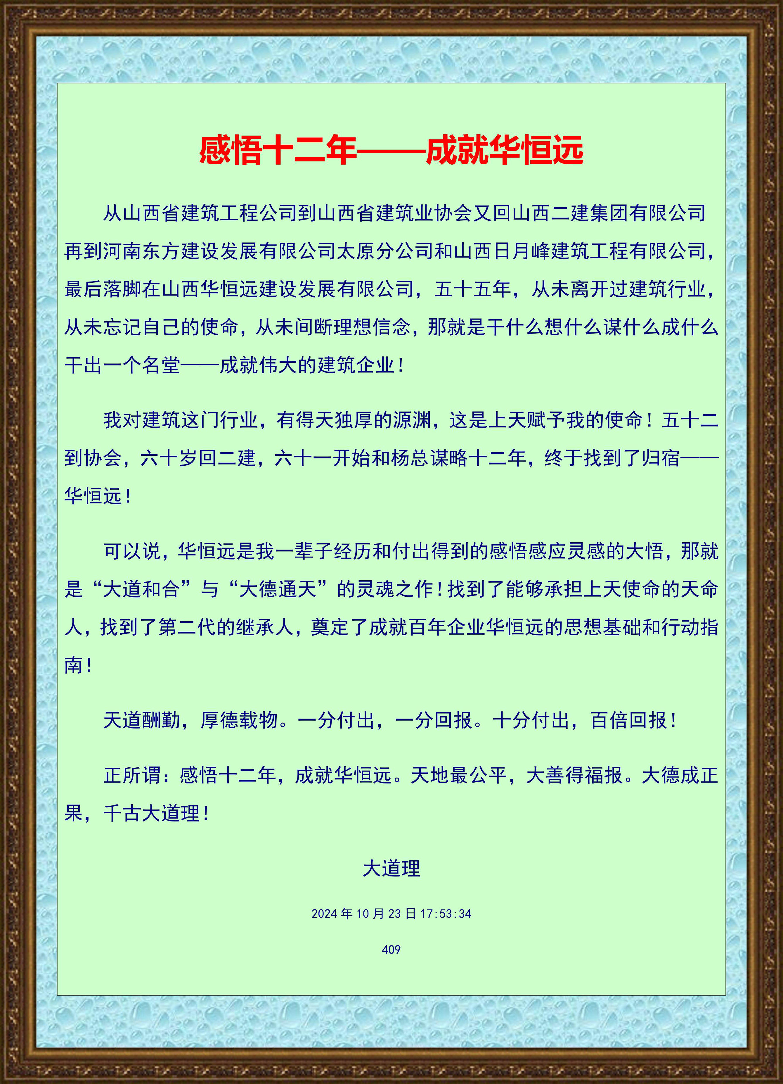 我对建筑这门行业,有得天独厚的源渊,这是上天赋予我的使命!五十二到协会,六十岁回二建,六十一开始和杨总谋略十二年,终于找到了归宿——乐天堂fun88!