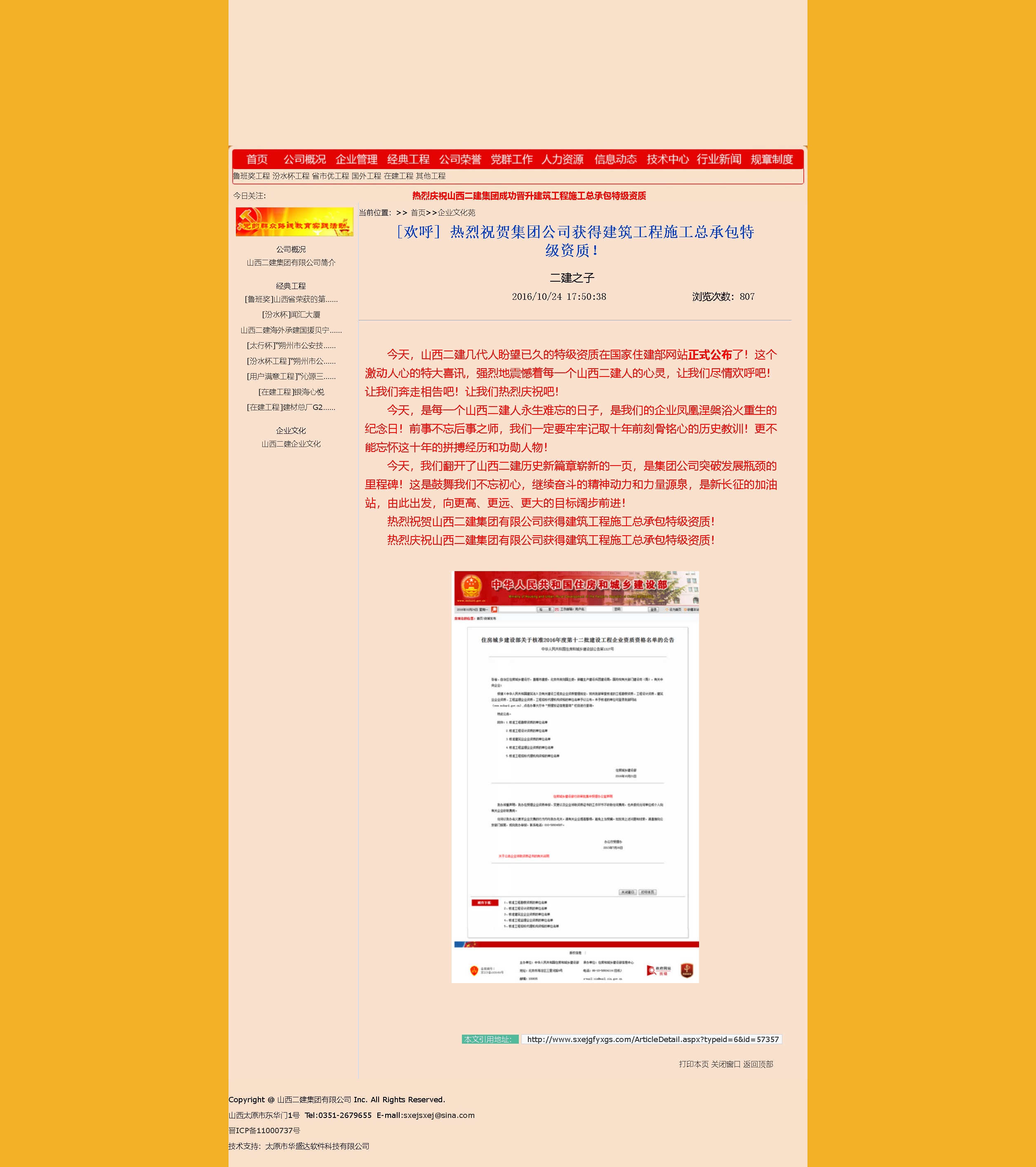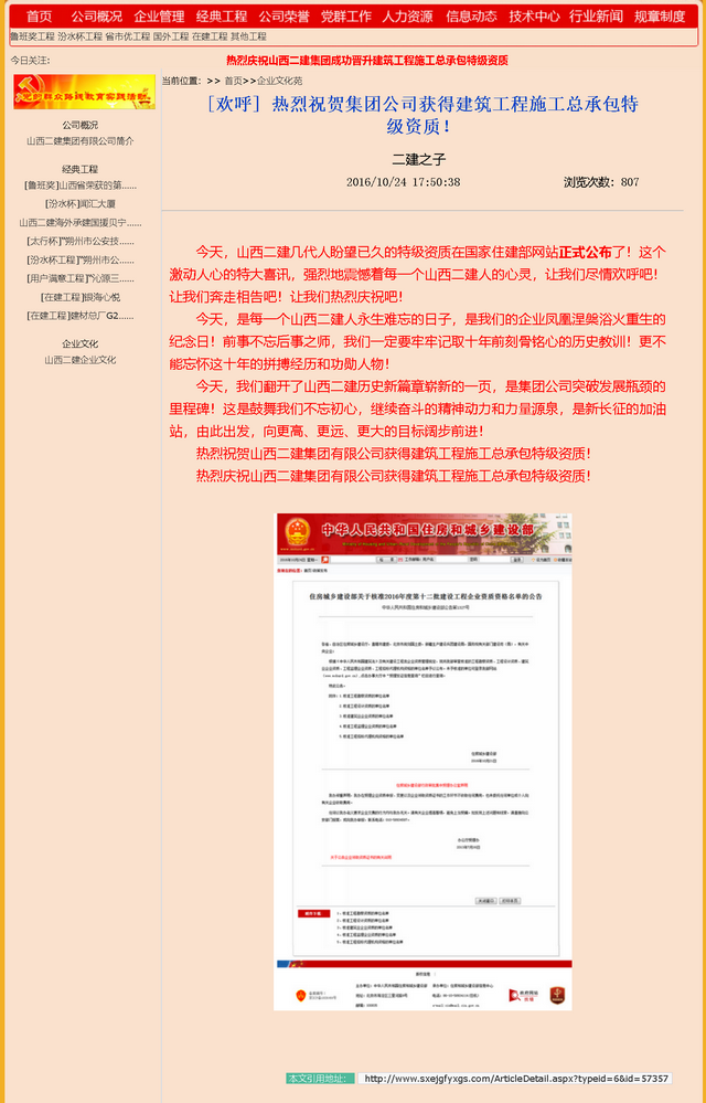 今天,山西二建几代人盼望已久的特级资质在国家住建部网站正式公布了!这个激动人心的特大喜讯,强烈地震憾着每一个山西二建人的心灵,让我们尽情欢呼吧!让我们奔走相告吧!让我们热烈庆祝吧!