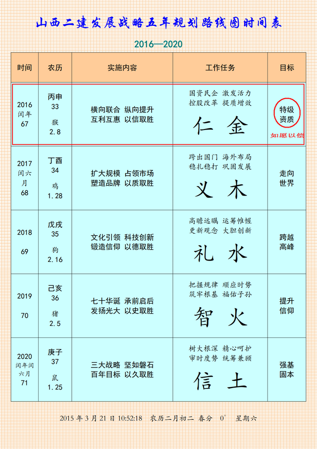 2011年1月5日第一次与山西二建第一任掌门人会悟,2015年1月5日山西二建集团有限公司挂牌成立,2016年获得住建部核准的建筑工程总承包特级资质,完美实现了《思考》第一阶段的战略目标!——这就是天机!