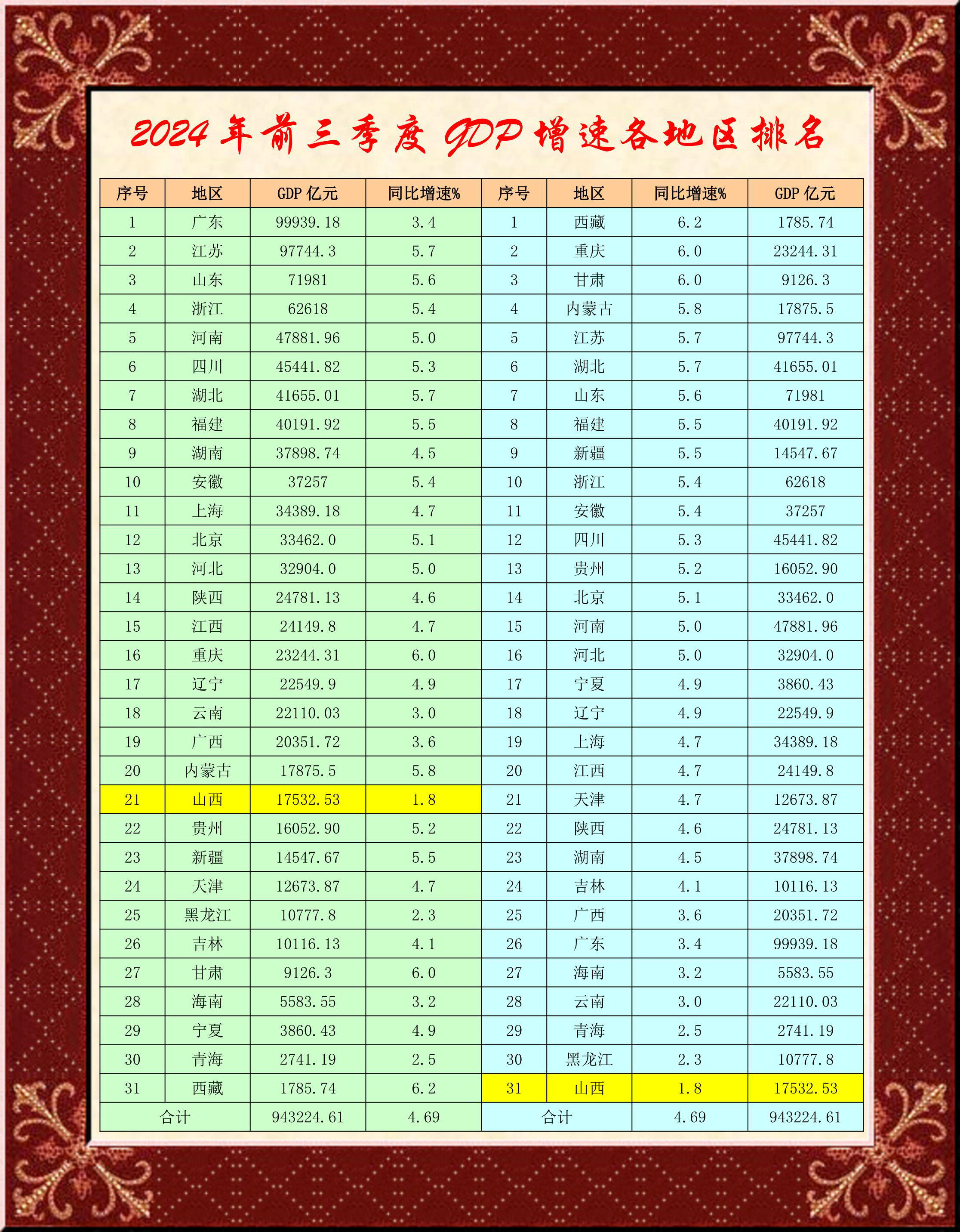 感悟31省份前三季度GDP,粤苏鲁浙扛大旗,豫川鄂闽超四万亿!
