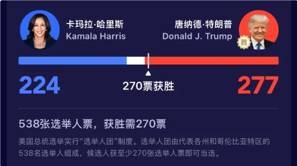 《纽约时报》的选举追踪器给出特朗普获胜的概率为 84%,而《华盛顿邮报》的预测则表示,特朗普有可能在选举团人选举中占优势。