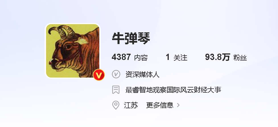 牛弹琴的博文和视频,对世界和人类社会以及国际政治经济,民族矛盾,军事冲突,错综复杂的利益关系展现出来,让人们对事物发生发展的规律性认识,有一个思维的空间和研究,可谓是仁者见仁智者见智。