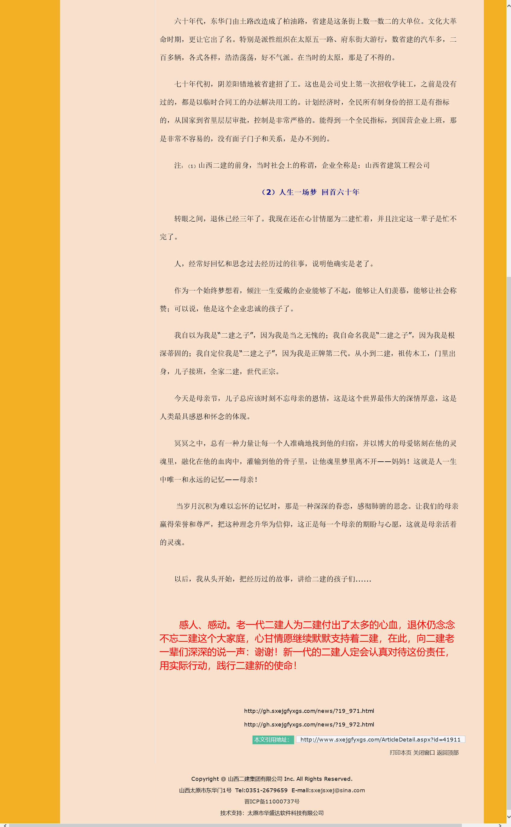 今天,再度把我在山西二建网站发表过的文章帖出,是对乐天堂fun88过去、现在、未来的期望和展望,希望每一个能够有缘在这个大家庭相聚的人们,把自己对企业的忠诚发挥到成就人生的高度,走好这条通往实现所有愿望和希望的大道,为未来的自己创造无怨无悔的明天!